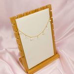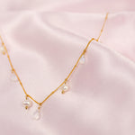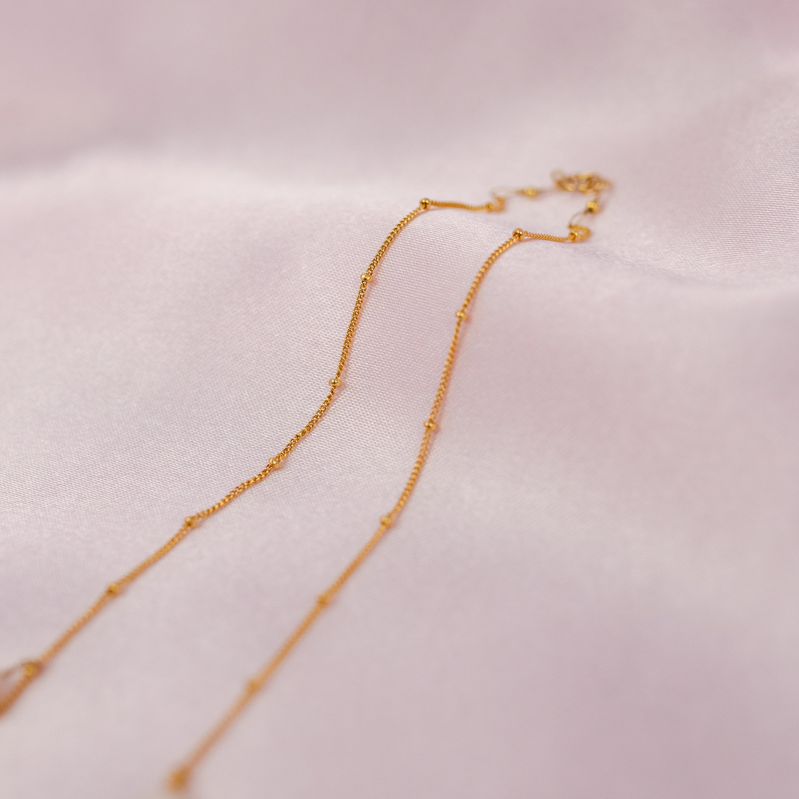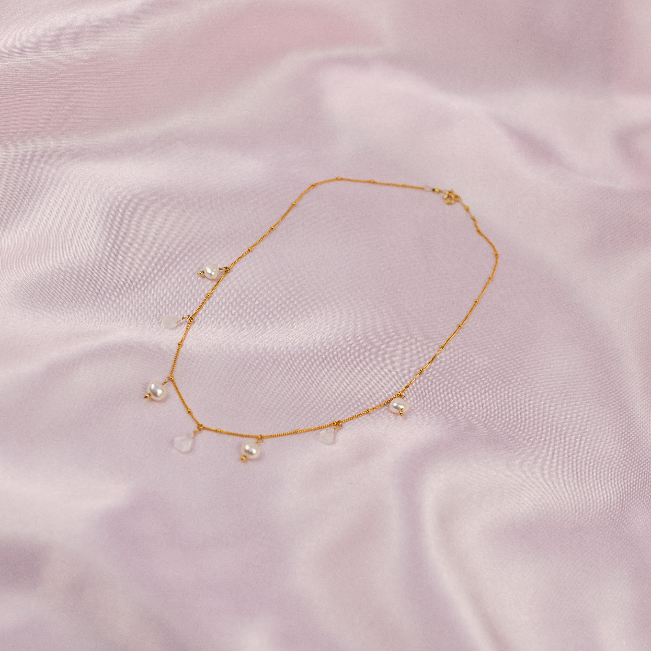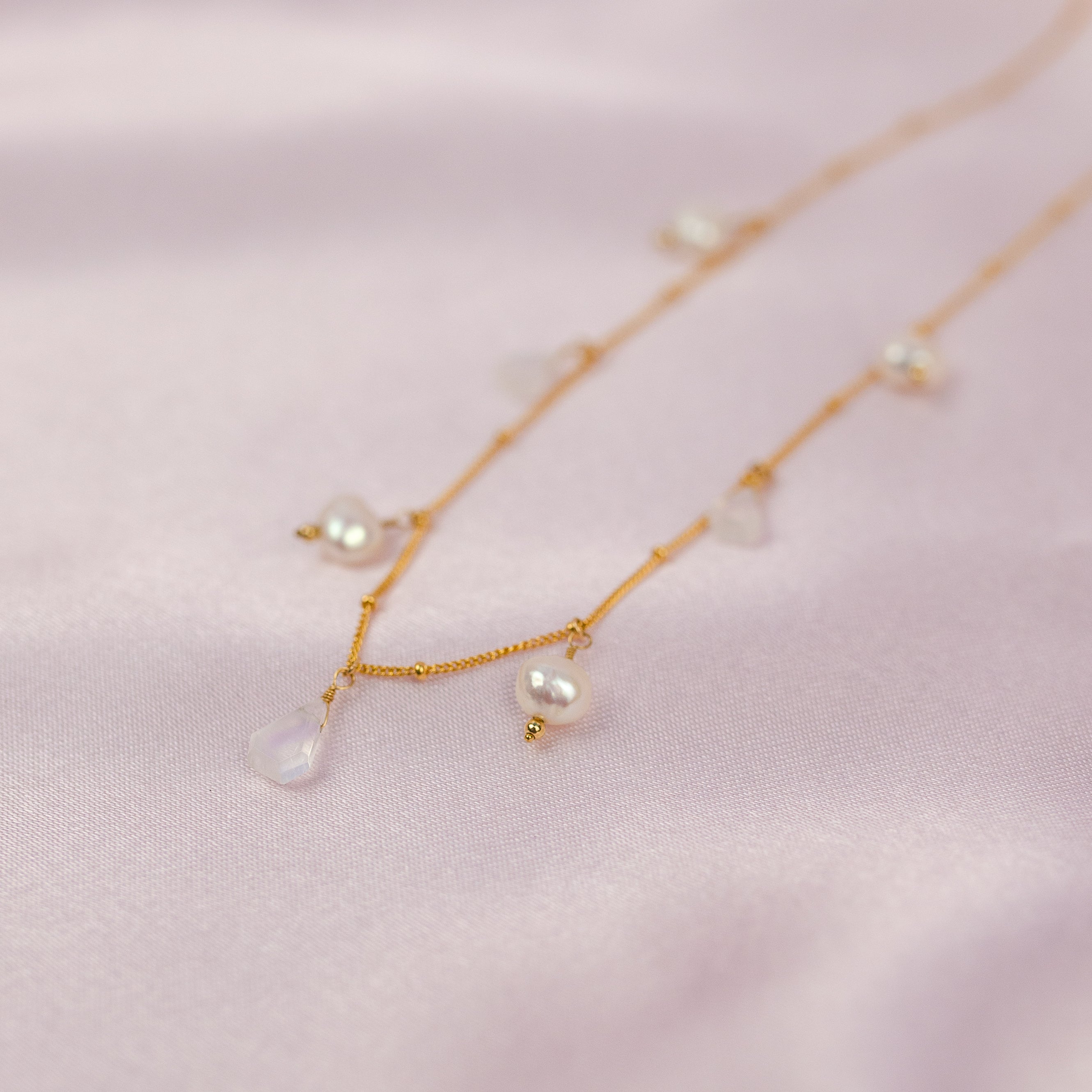 Along a dainty gold filled satellite chain sit an array of shimmering Pearls and Moonstone. Selected for their mystic colour changes, each stone provides a unique spectrum of colour.