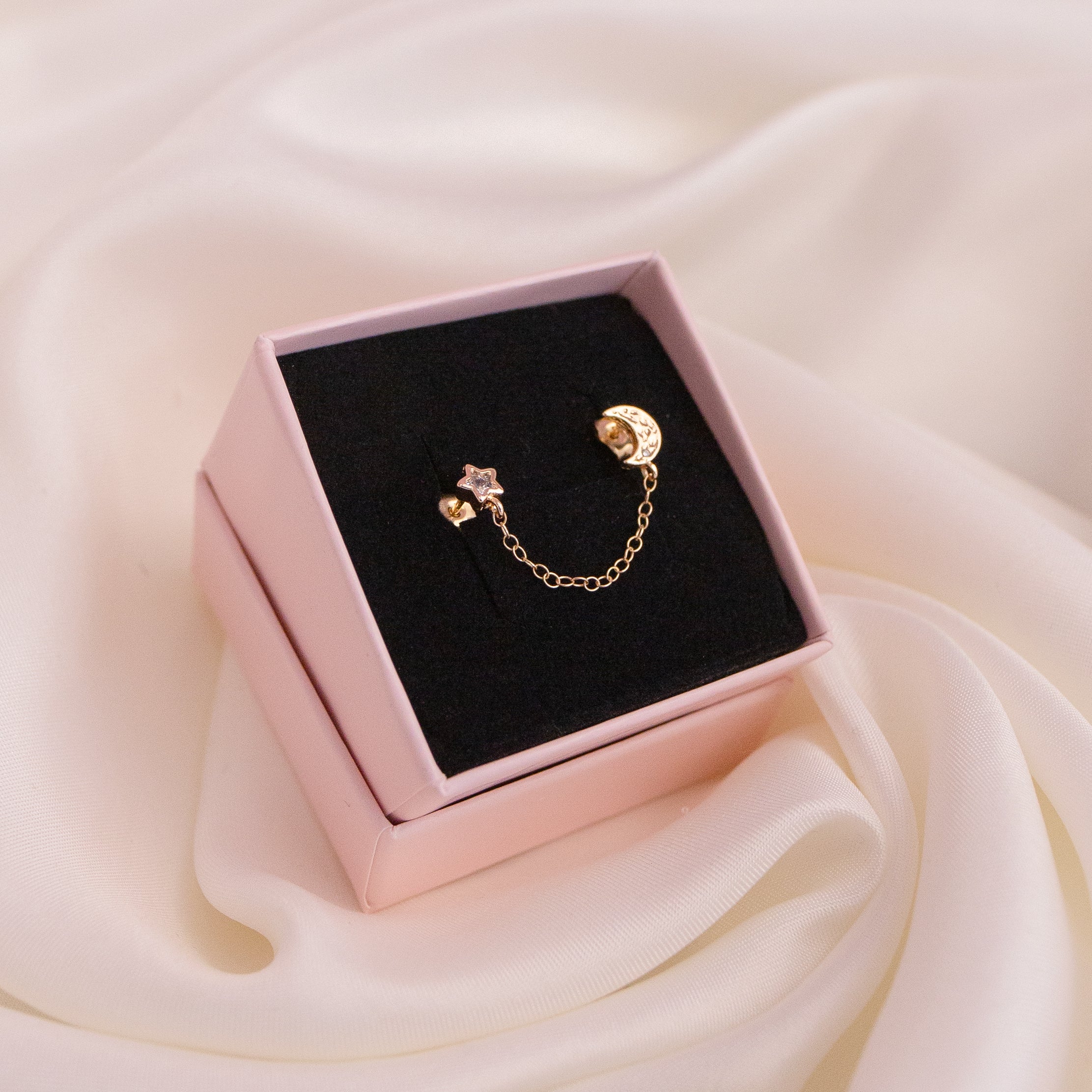 Linking between the celestial sparkles of the zircon star stud and crescent moon, The Aquila chain studs in gold are the latest addition to our stacking collection.