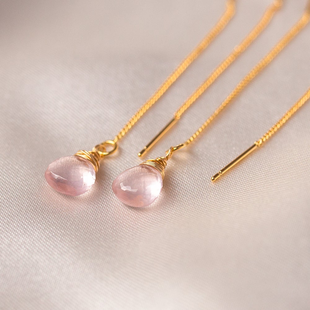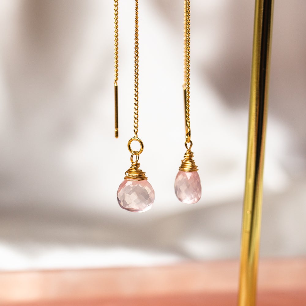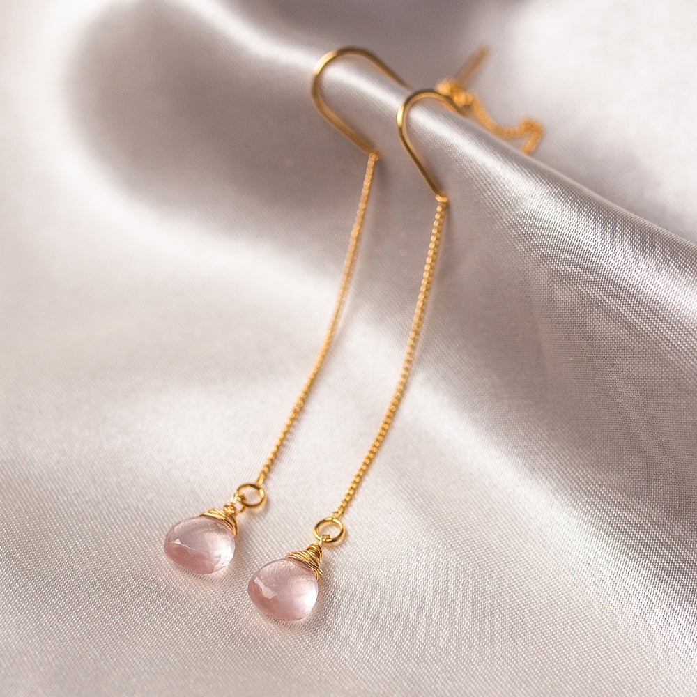 Wrapped in 9kt gold filled wire, Rose Quartz is known for being the crystal of unconditional love, promoting friendship, self-love and deep inner healing. Hanging from two dainty gold plated chains, the structured wire in the middle keeps these earrings light, secure and comfortable.