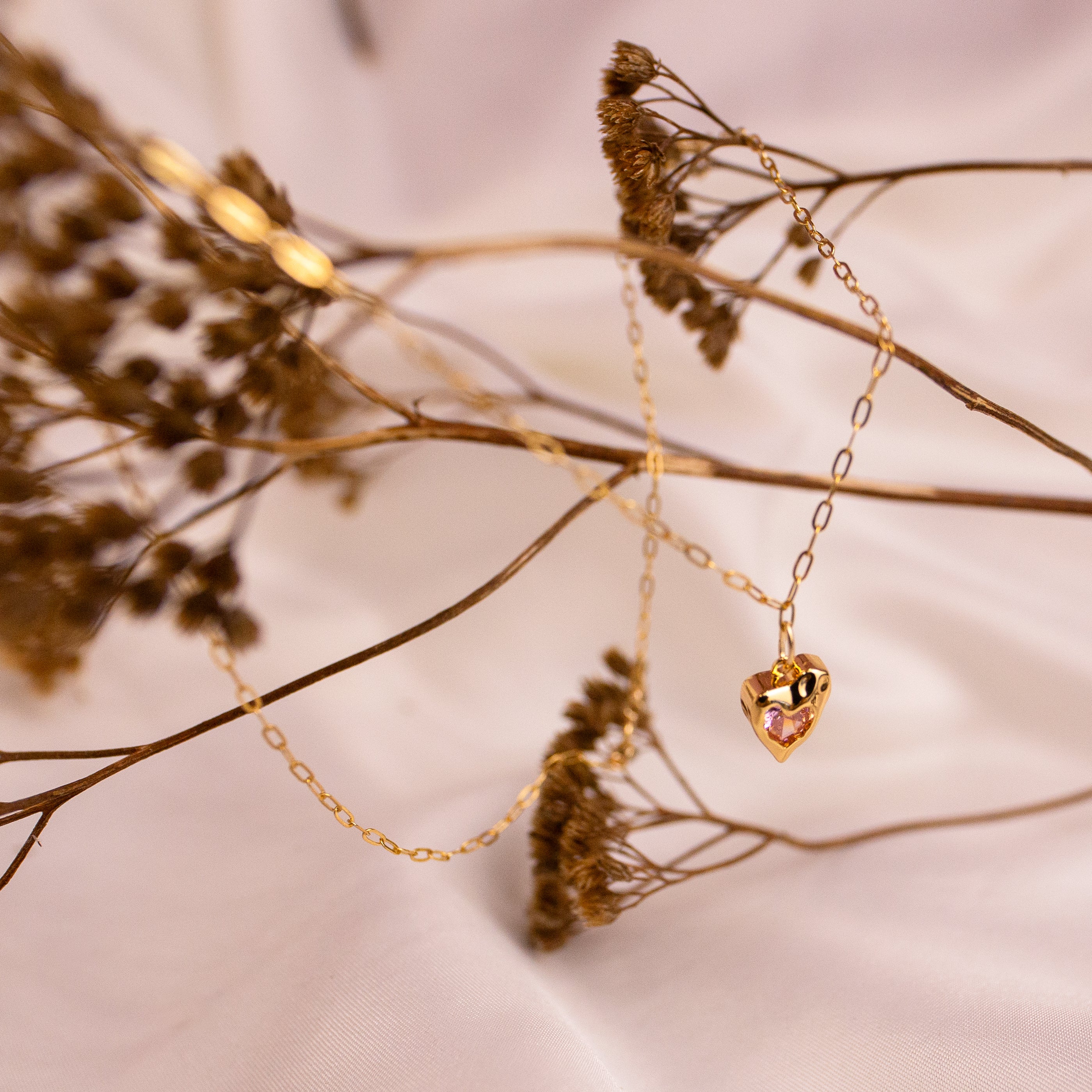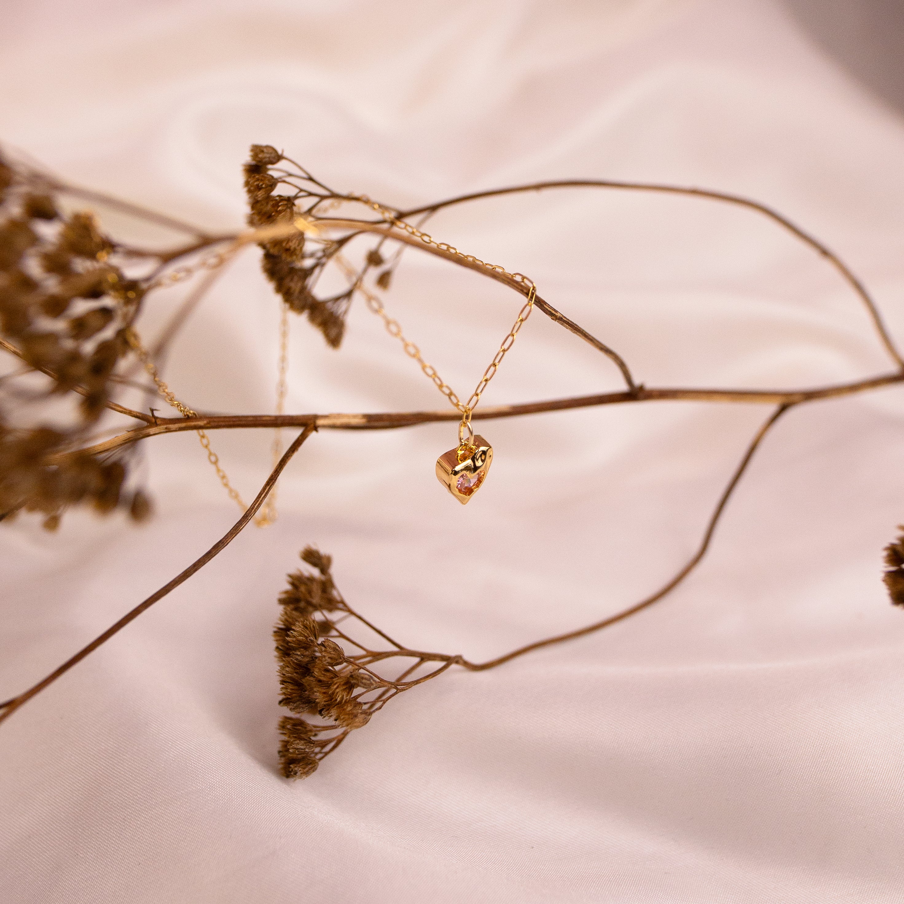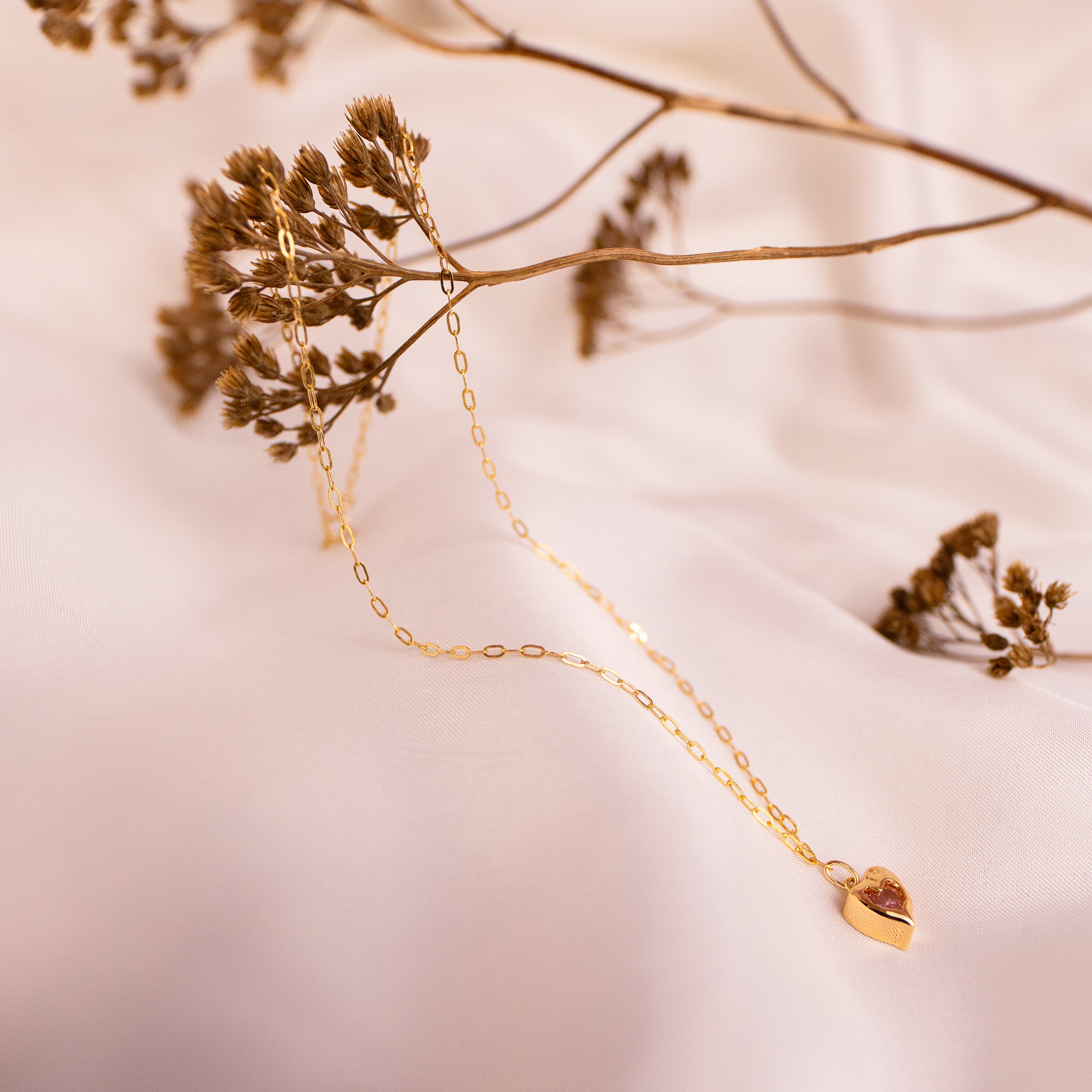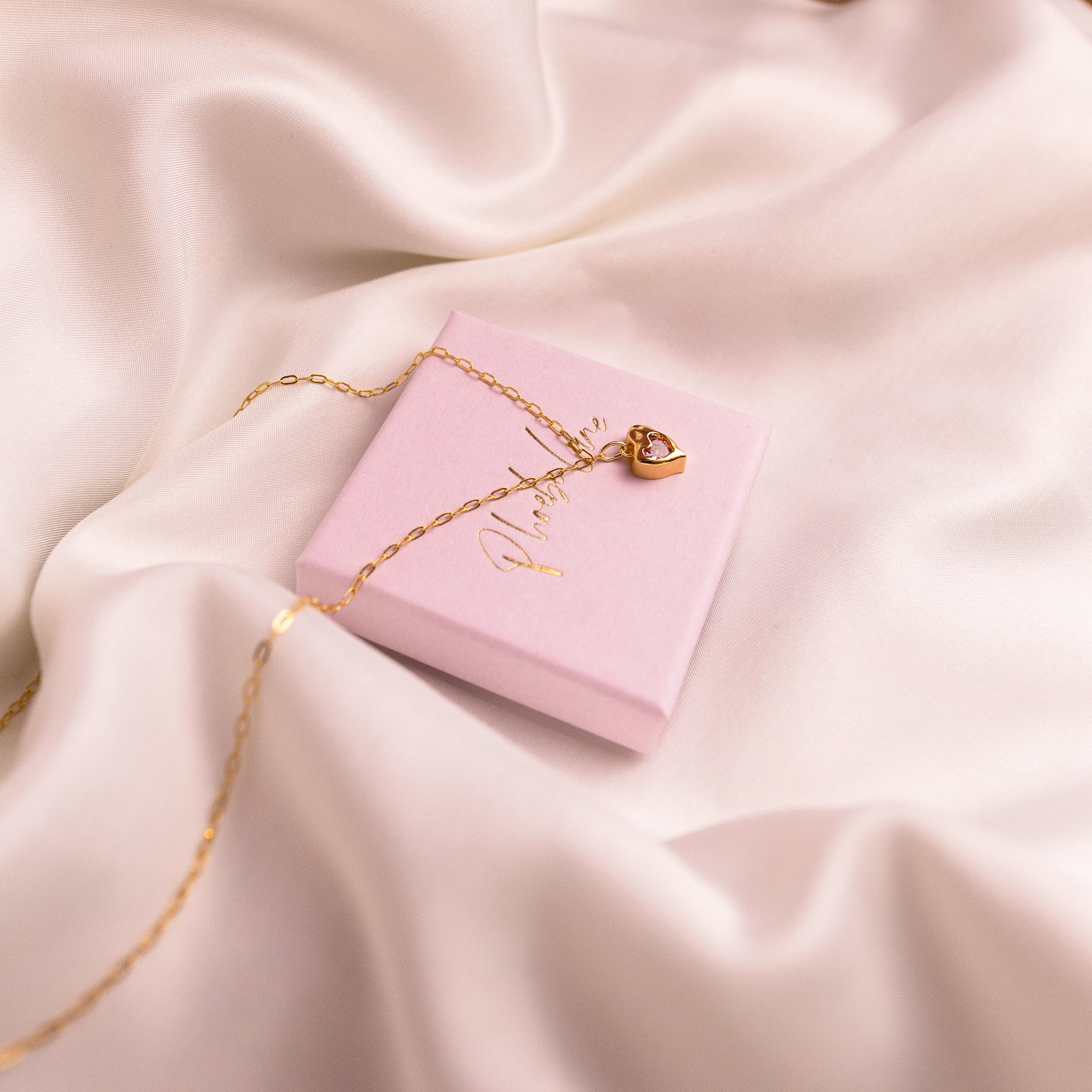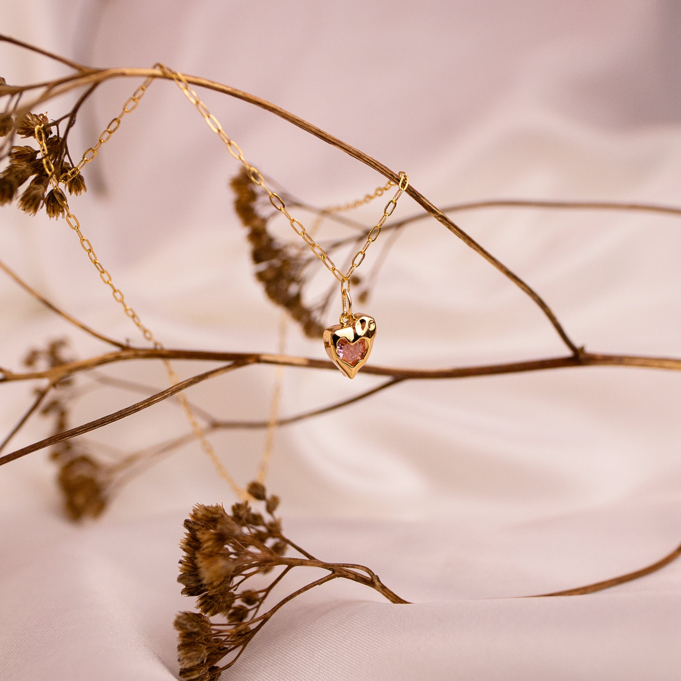 Along a dainty Gold Filled link chain sits the golden, sparkling pink melting heart from our Charmed series. This necklace aims to enhance self love and manifestation whilst banishing negativity and reclaiming confidence.