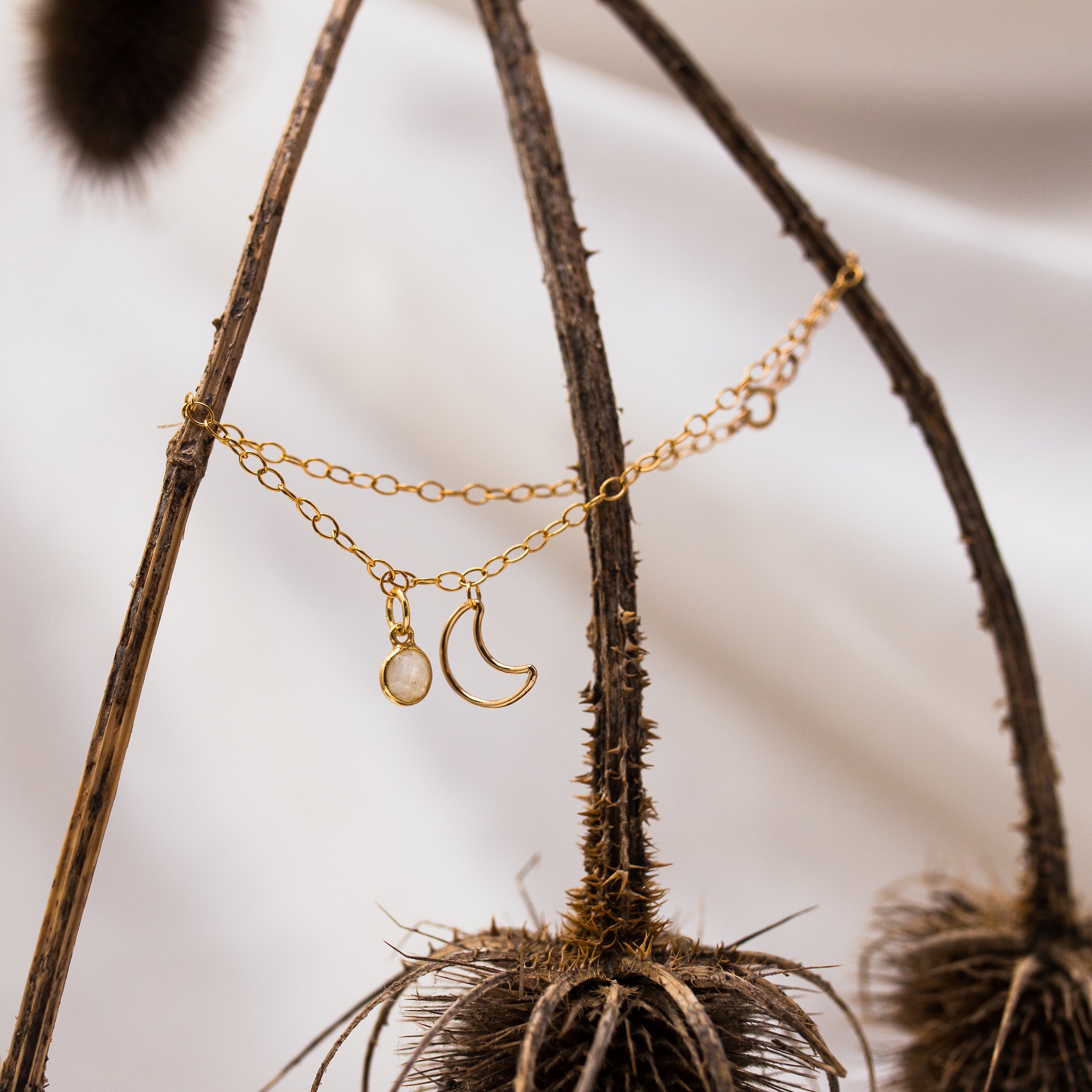 Featuring a gold filled crescent moon and gold vermeil Moonstone droplet, this bracelet will aid in healing and calming the body and mind. Acting as a reminder that the difficult times will pass, the crescent enhances the powers of the Moonstone: balance, harmony and hope while aiding creativity, compassion, endurance and inner confidence.