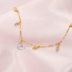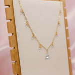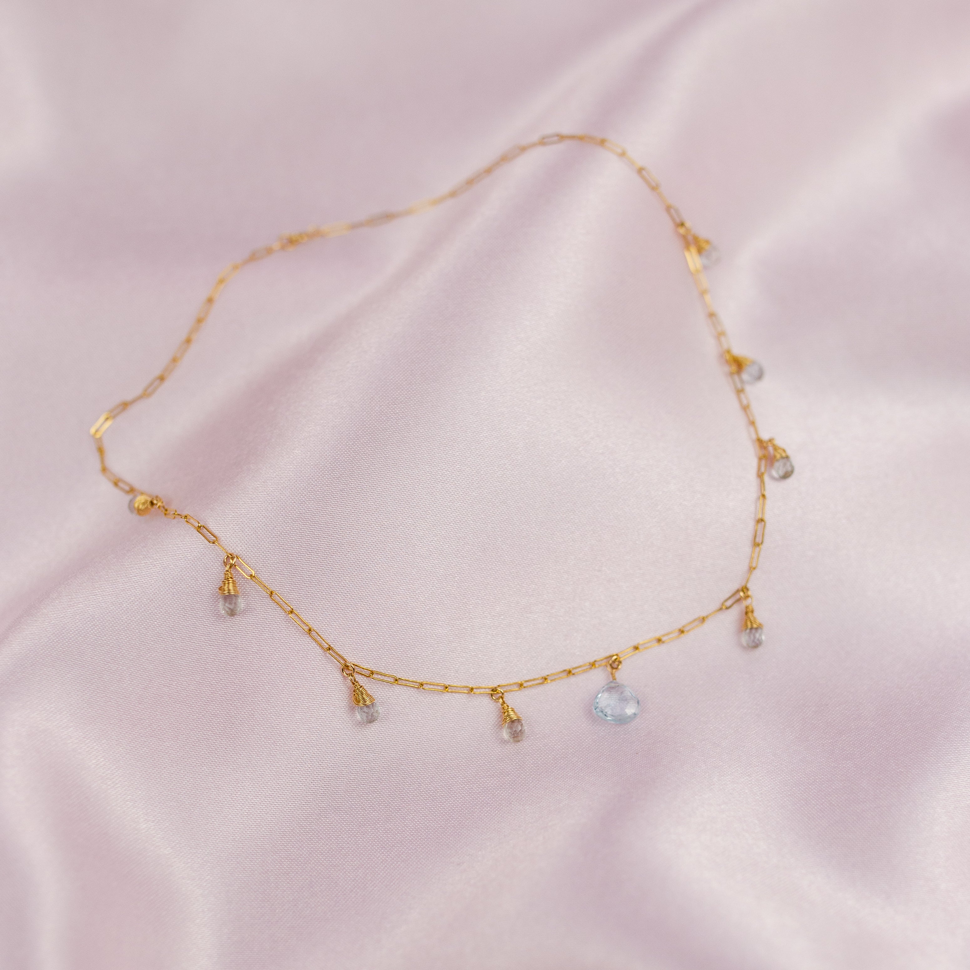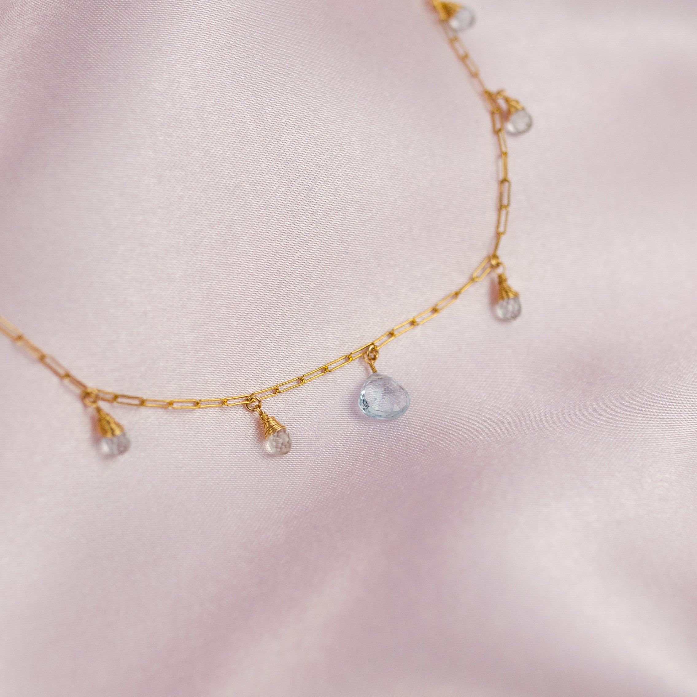 Along a gold filled link chain sit 9 crisp, clear fresh blue Aquamarine stones. Wrapped in gold filled wire, this necklace is dusted with small Aquamarine teardrops and features a larger Aquamarine stone in the centre.