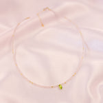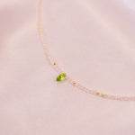 Finished with a fresh green Peridot marquise, the Cupid necklace is paired with a gold filled extender cable and gold filled mini heart tag. Beneath the stones is a strong stainless steel and gold wire to create a lightweight structure and enhance the strength and shape of the necklace.