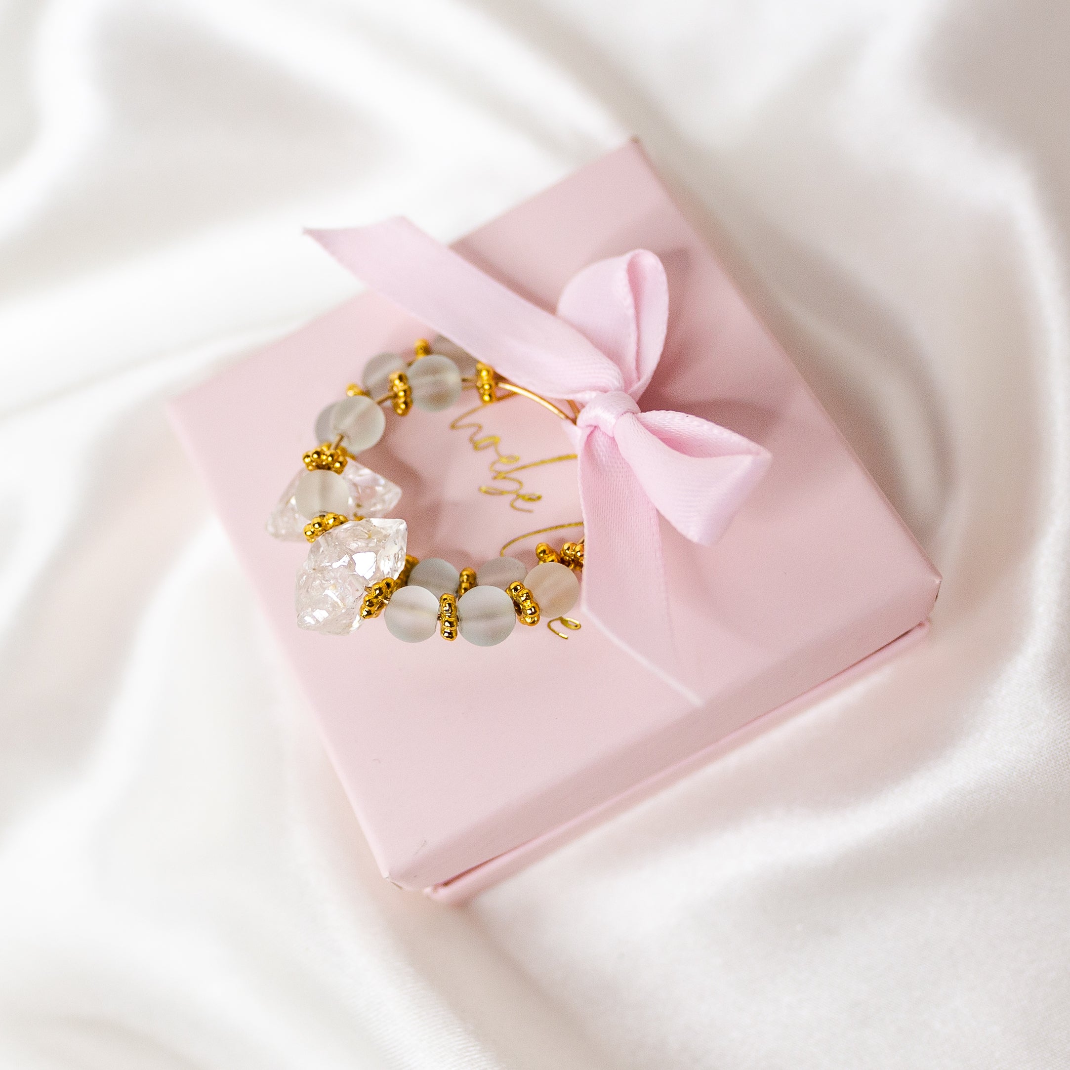 Due to the use of real crystals throughout our products, we recommend removing any jewellery before exercise, showering or perfume application. This will help keep the integrity of the crystals and maintain the sparkly nature of your pieces.