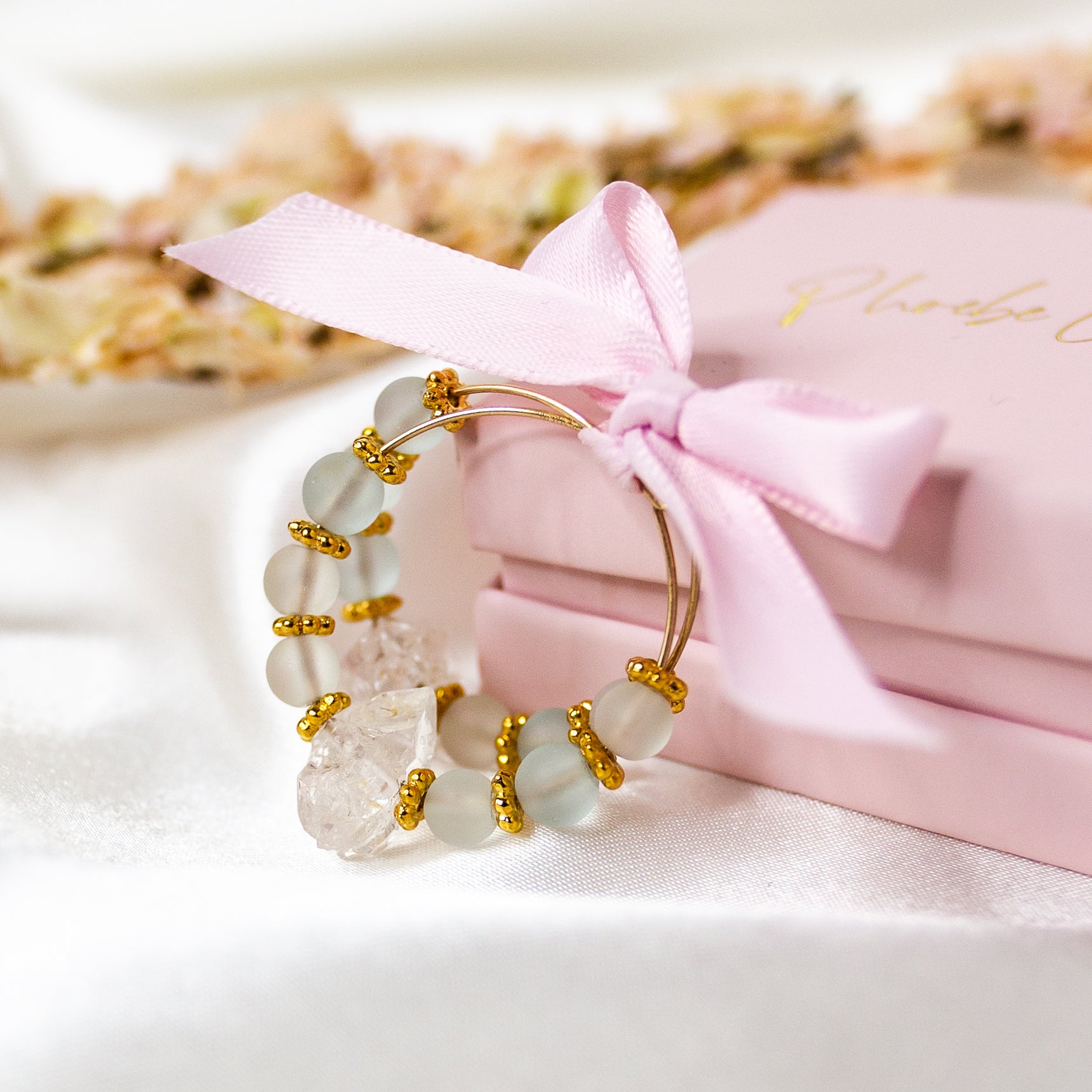 Surrounded by Sea Glass (known for representing new beginnings and healing), the Herkimer Diamonds are one of the most precious forms of Quartz. Radiating high frequency vibrations, they become strong manifestation tools and enhance the powers of the wearer.