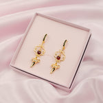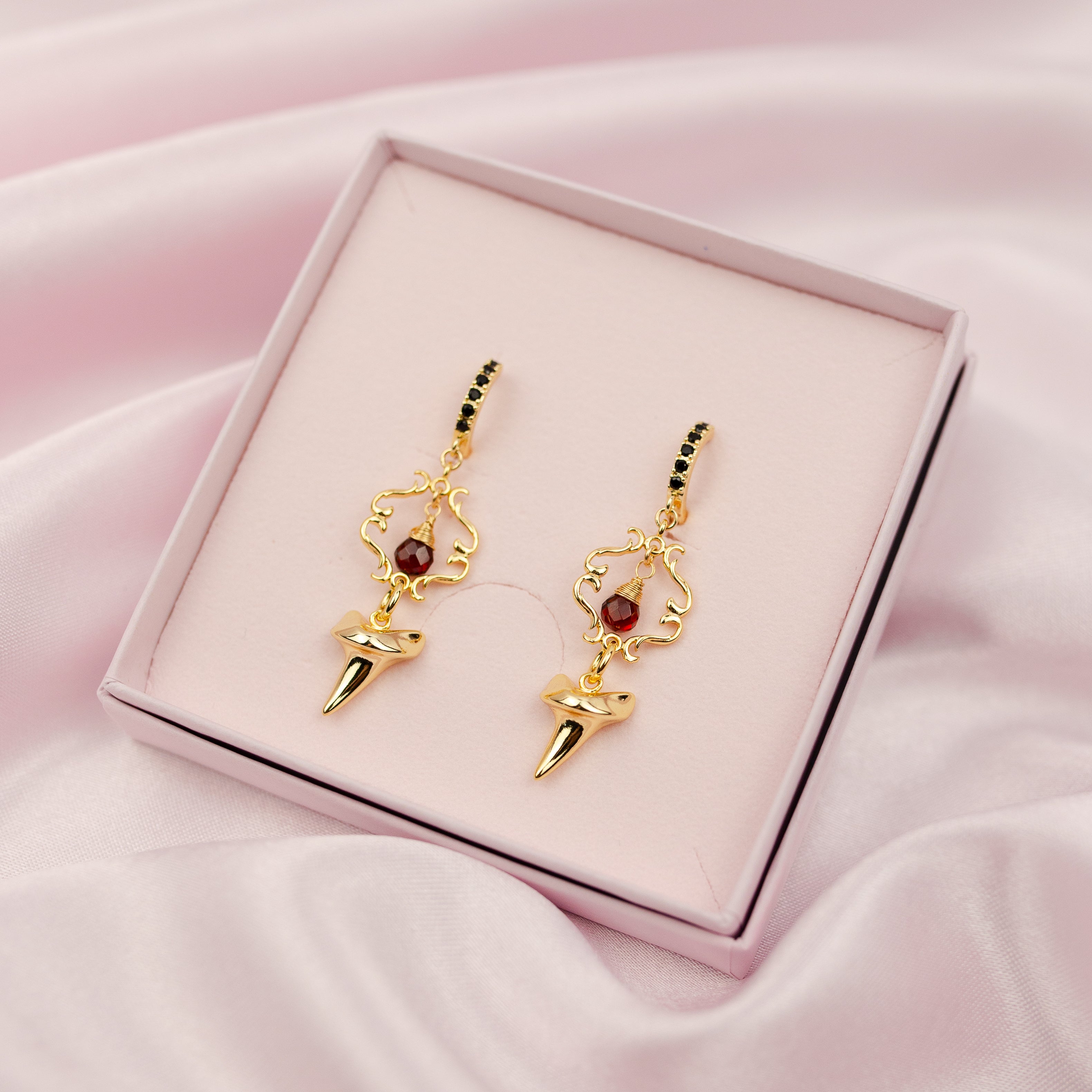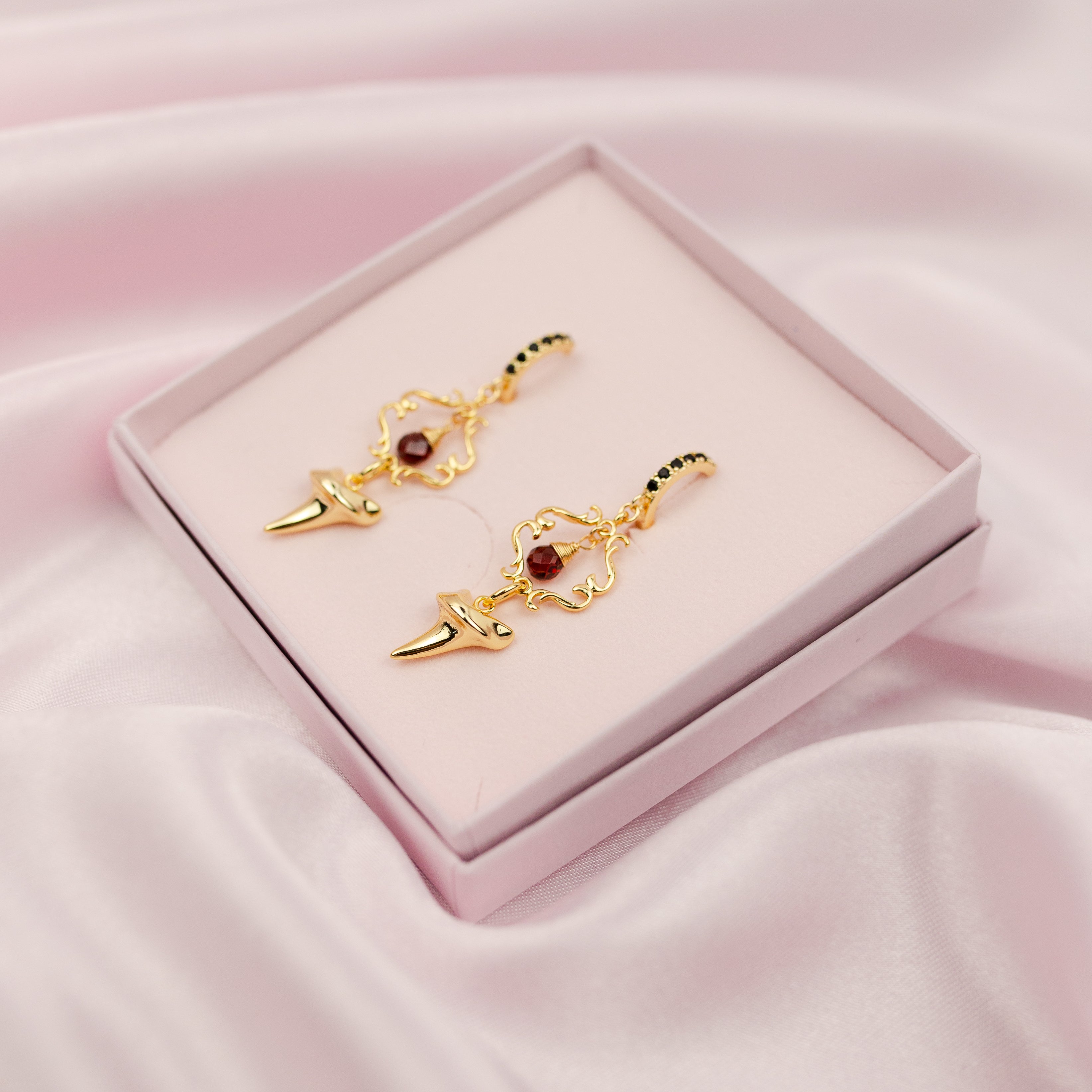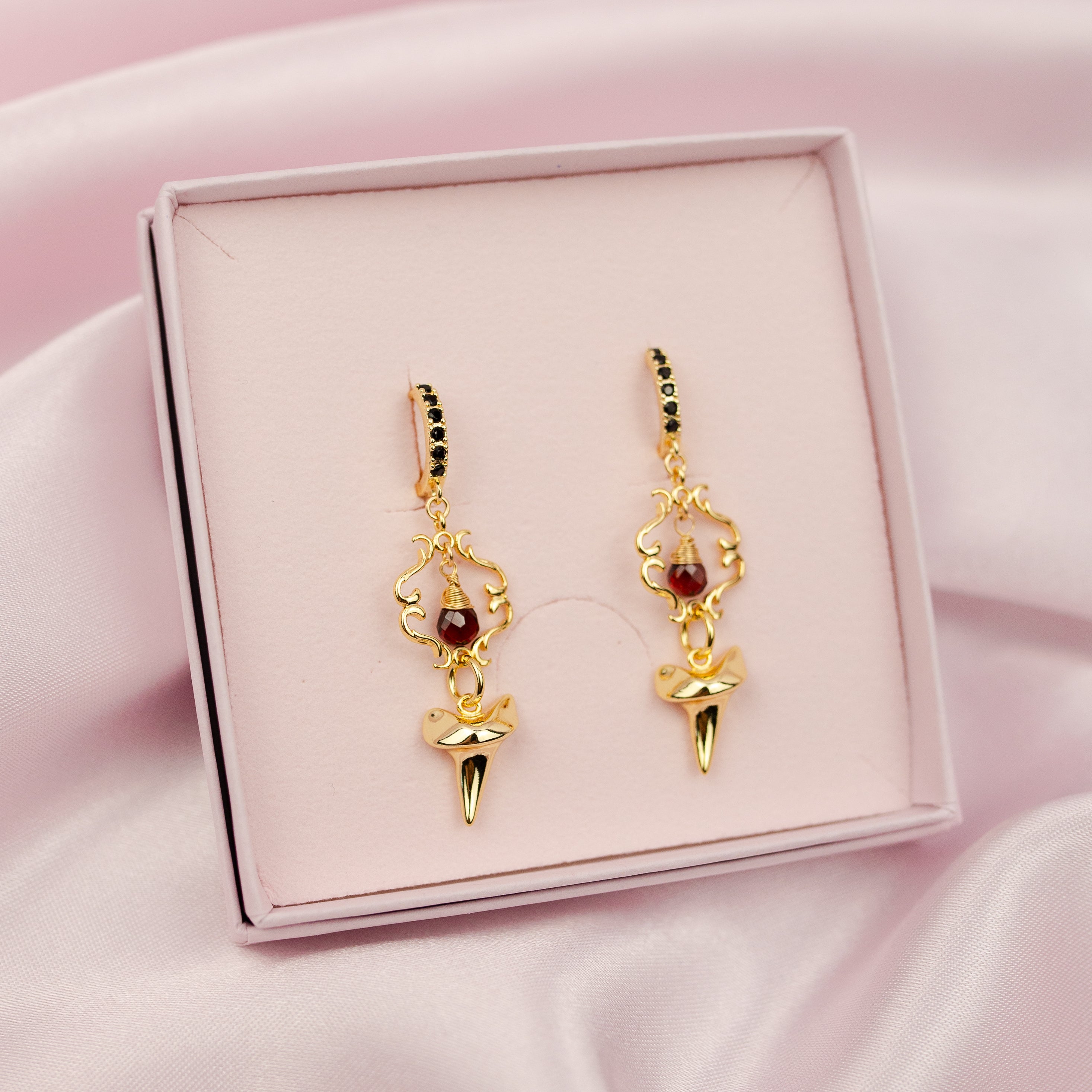 Holding the luck of the golden shark tooth and the protection of Garnet, the Onyx huggies are the perfect embodiment of Fortuna, the Goddess also known as Lady Luck.