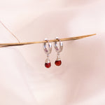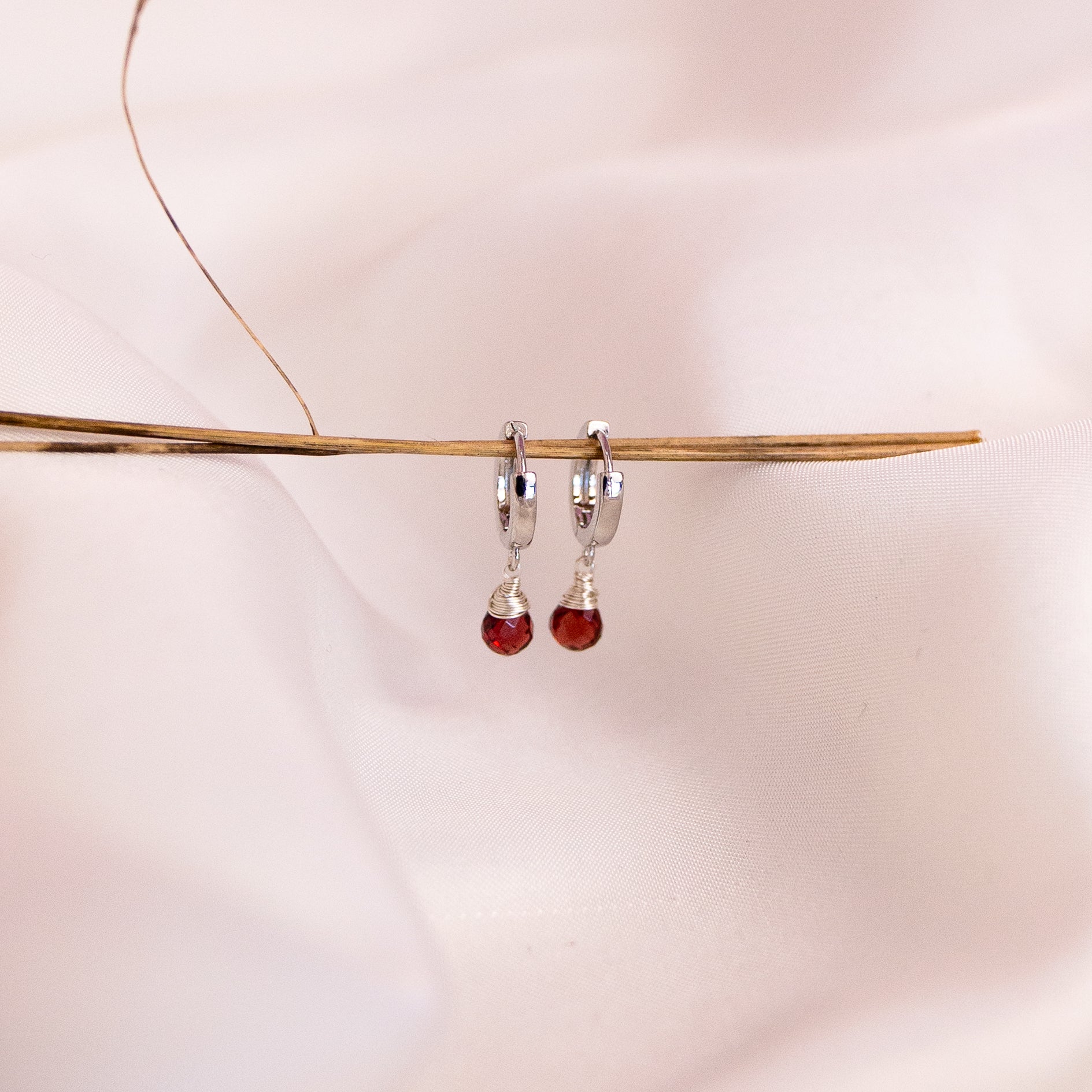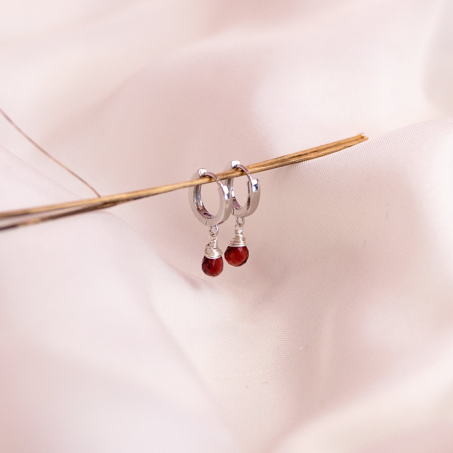 These Classic huggies are finished with a juicy Garnet teardrop, hand wrapped in gold filled/sterling silver wire.