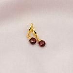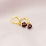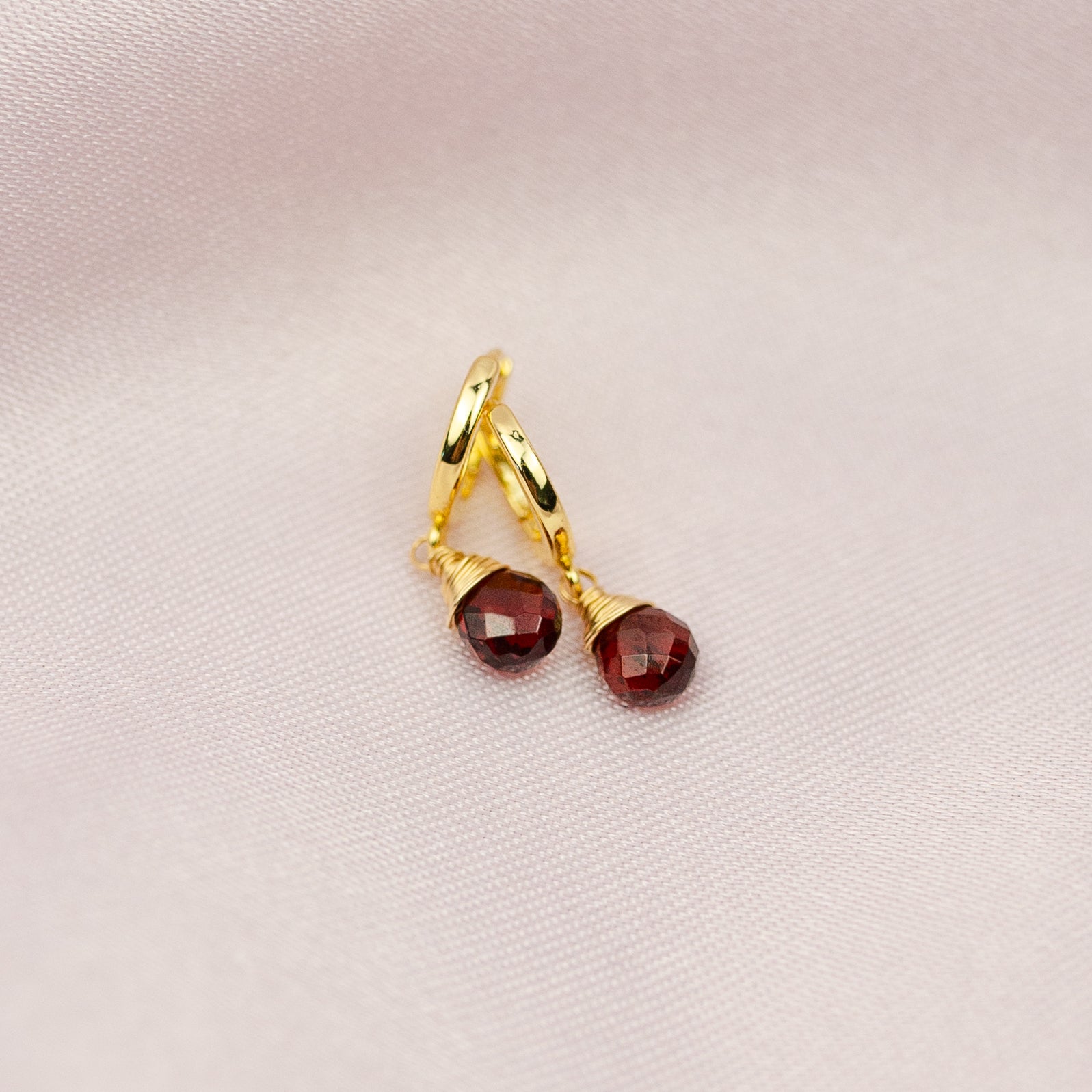 These mini huggies are finished with a deep red Garnet, hand wrapped in gold filled wire.