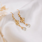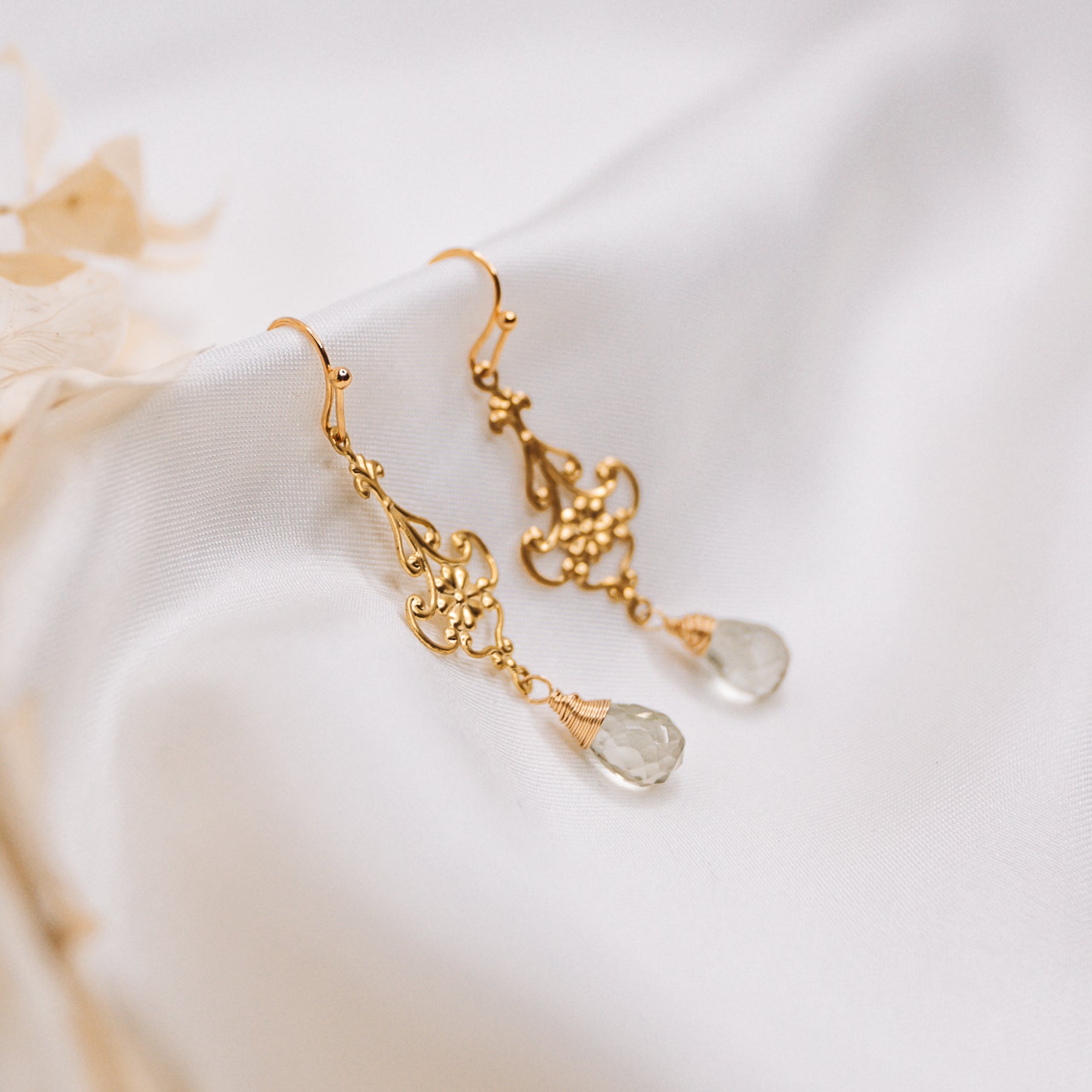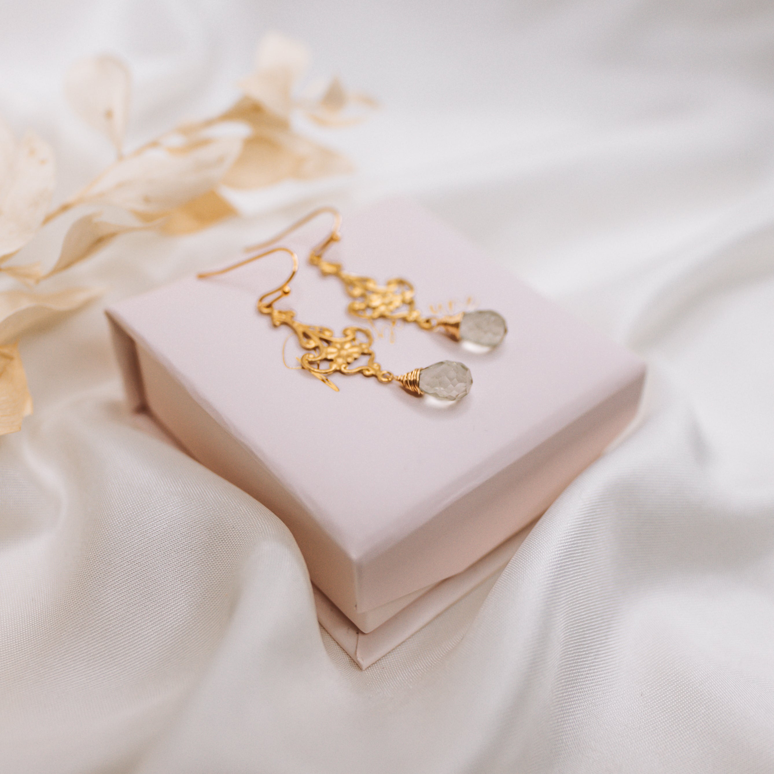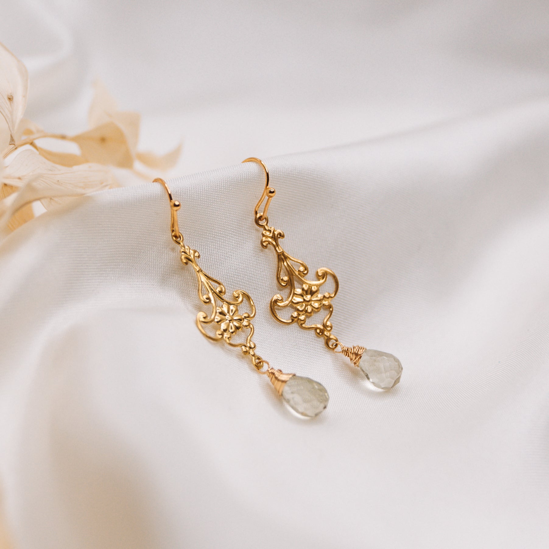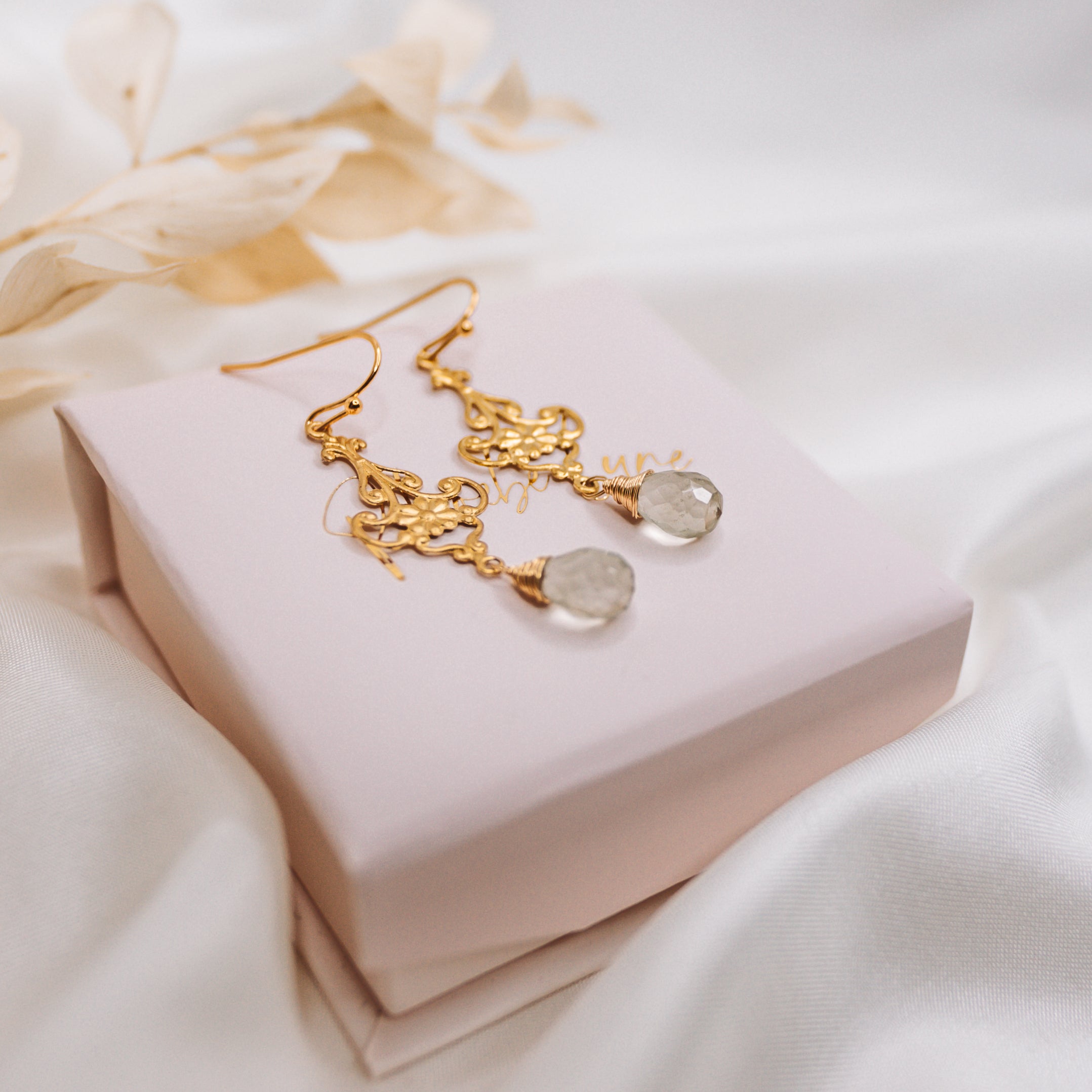 Adorned with golden filigree, the Green Amethyst Endellion hooks bring a lightweight, regal addition to your collection.
