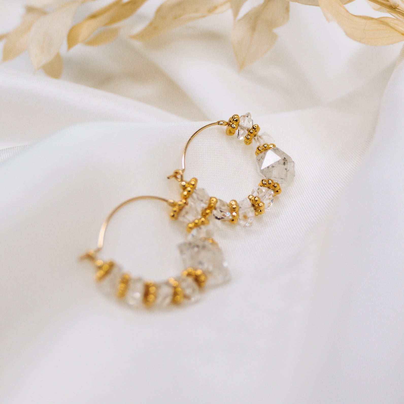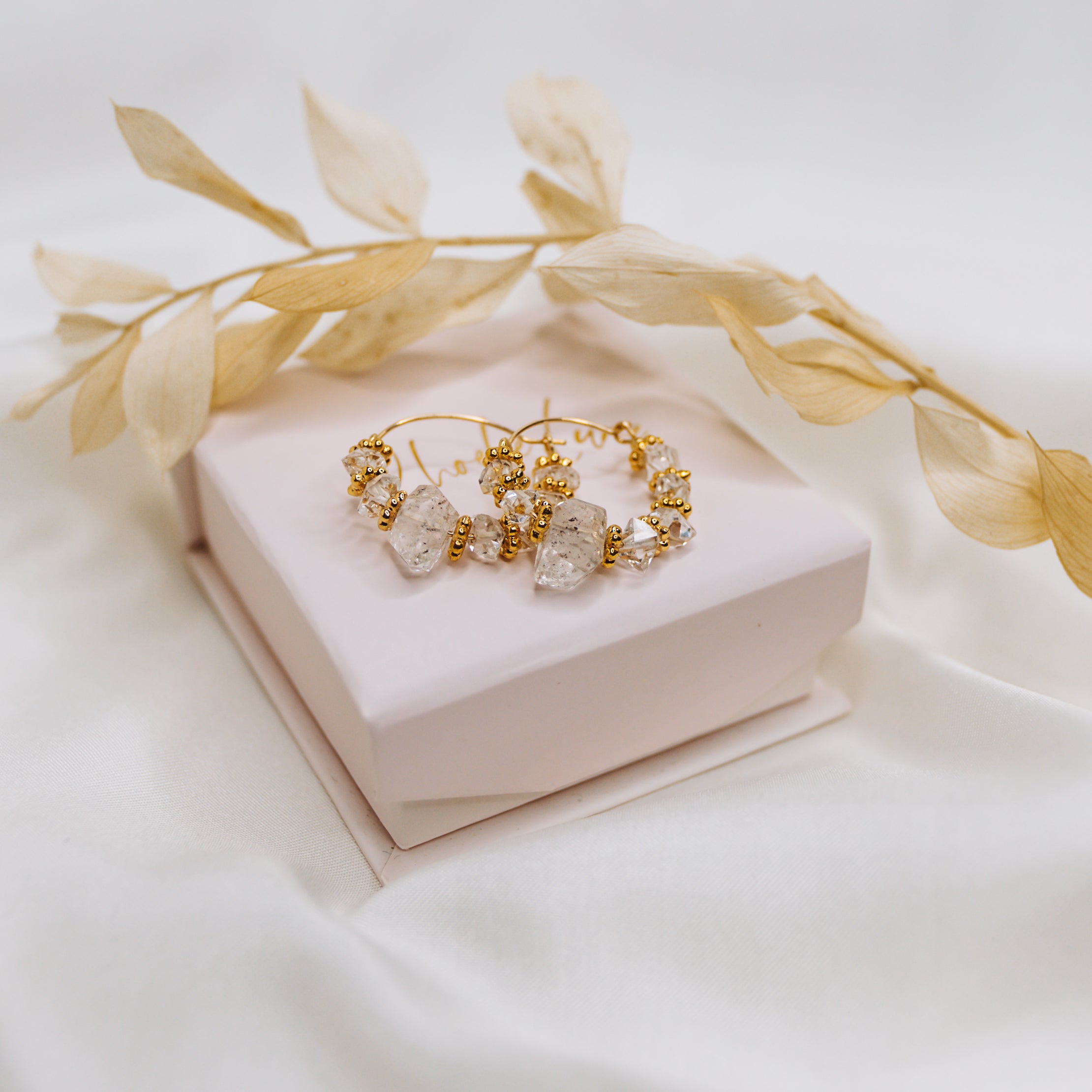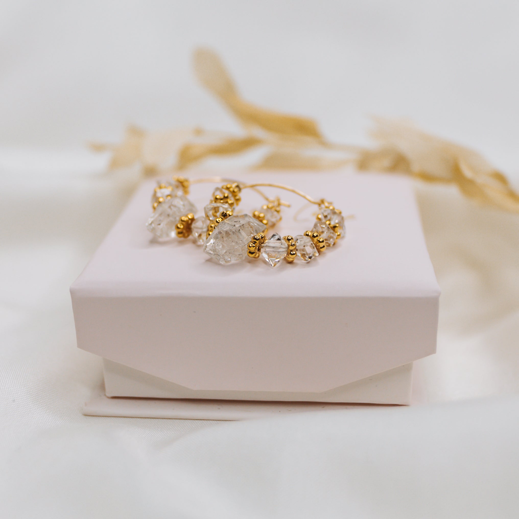 Dusted with Herkimer Diamond and speckled with golden flowers, these chunky gold filled hoops are the perfect edition to any outfit. With the high clarity of the Herkimer Diamond, their unique shape draws in positive energy while bouncing the natural light across the hoops and making them a magical feature piece.