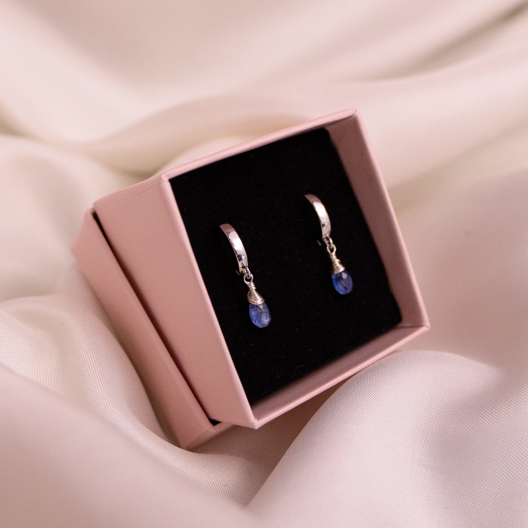 These Classic huggies are finished with a Kyanite teardrop, hand wrapped in gold filled wire.