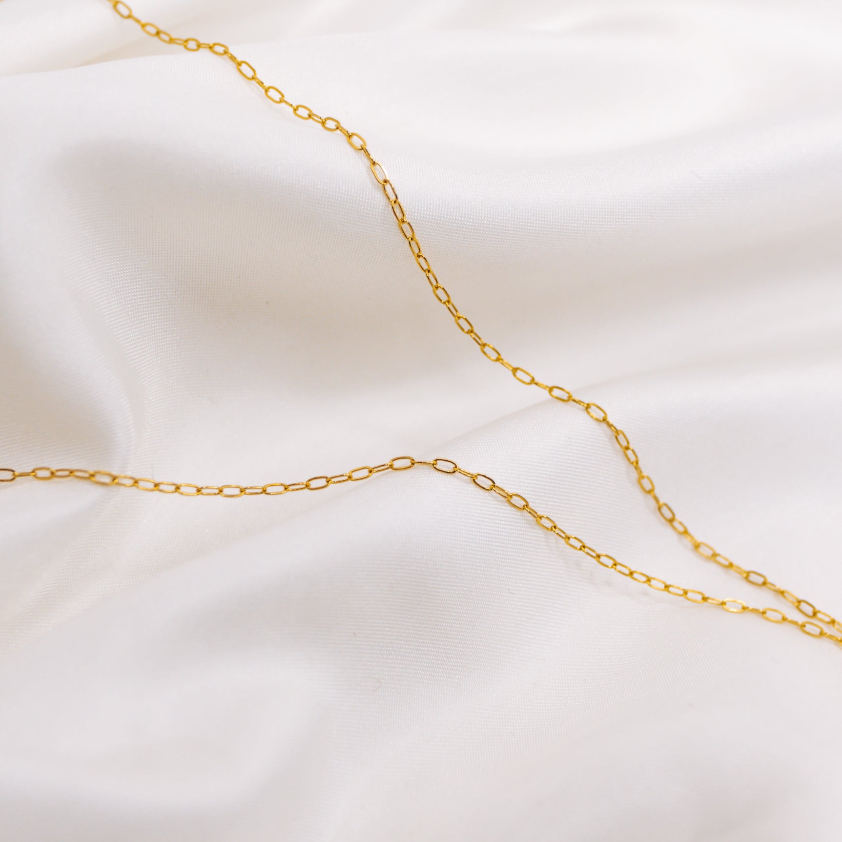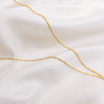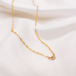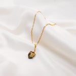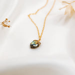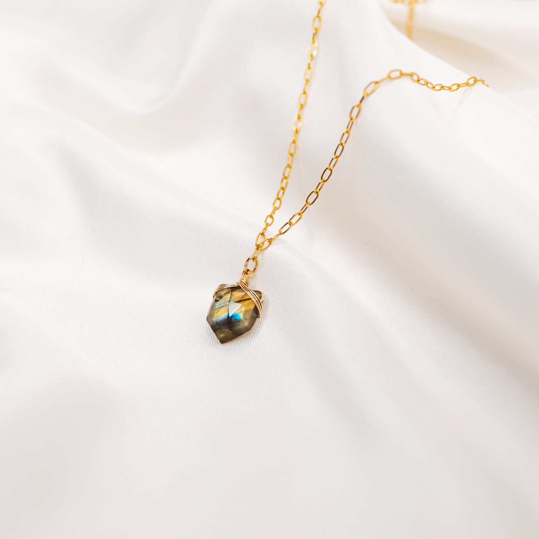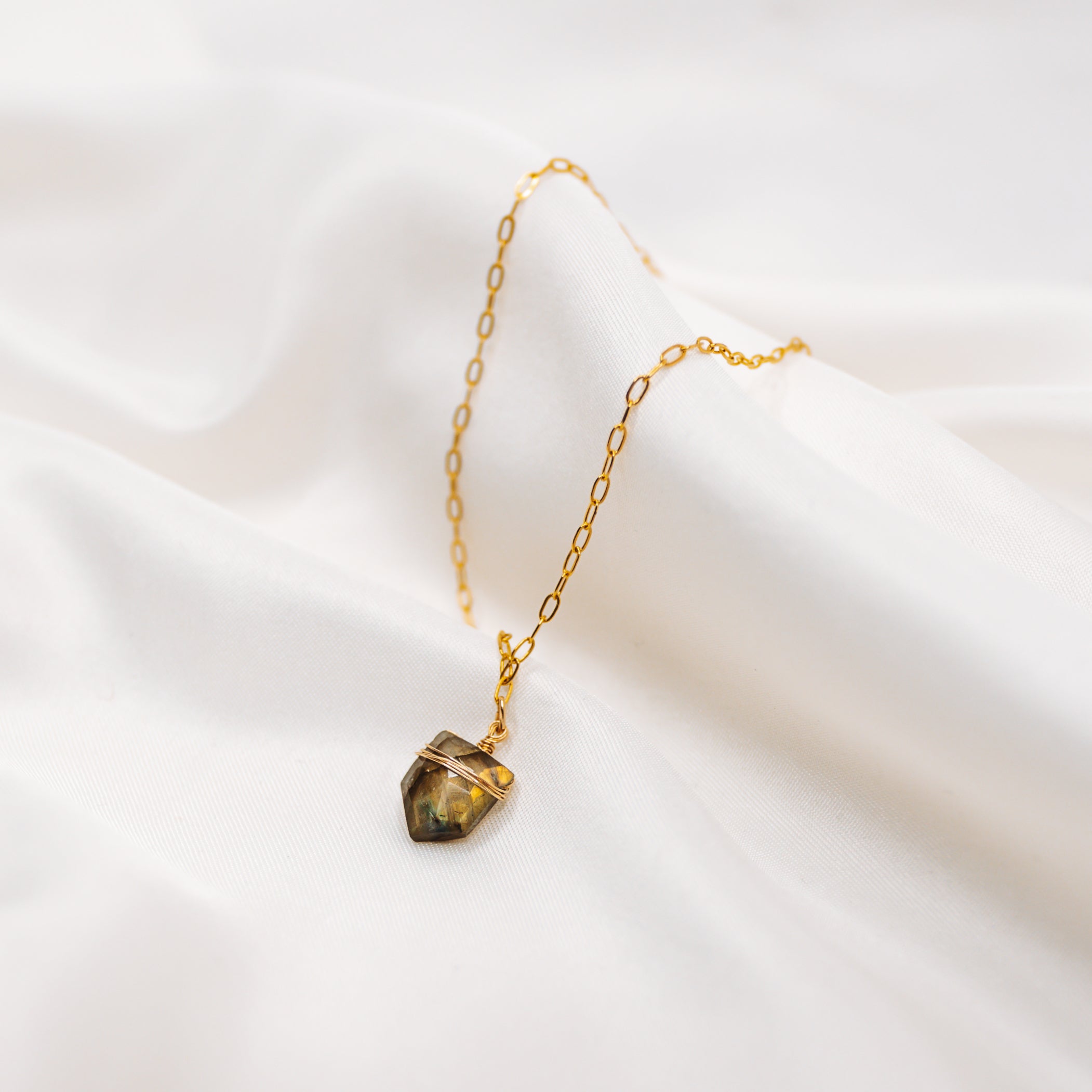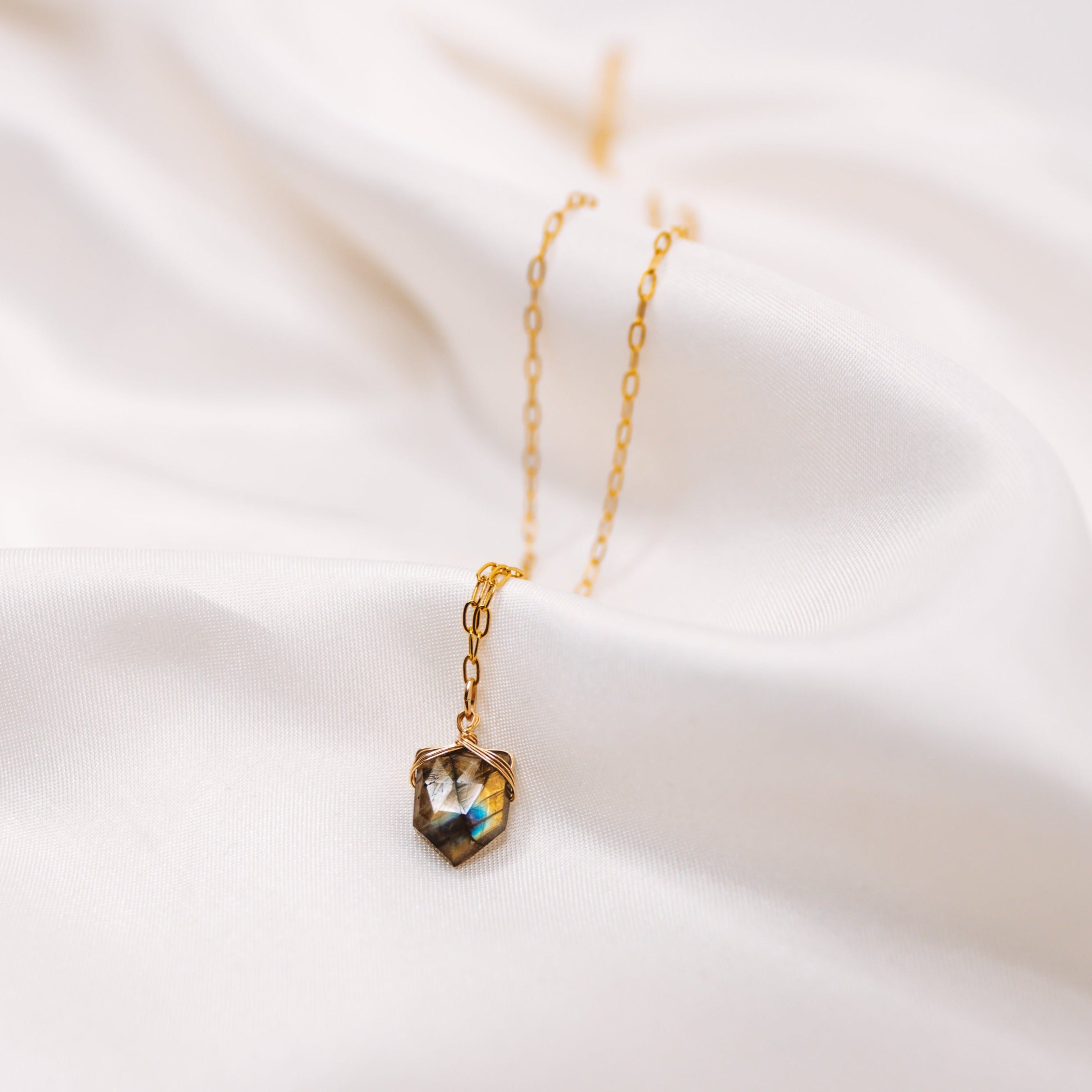 Designed to sit just below the collarbone, this gold filled chain link necklace measures 18" and homes a hand wrapped, Labradorite shield.