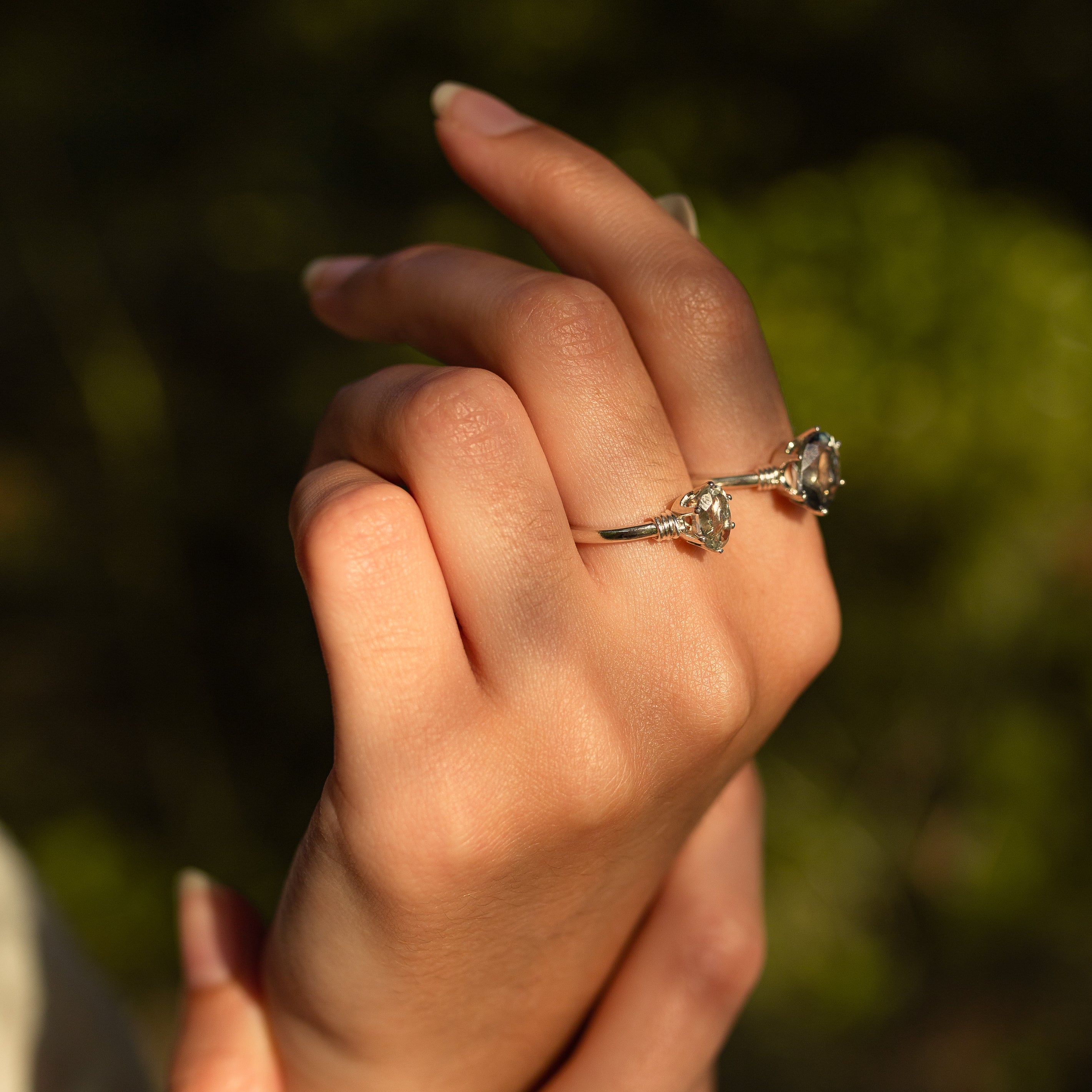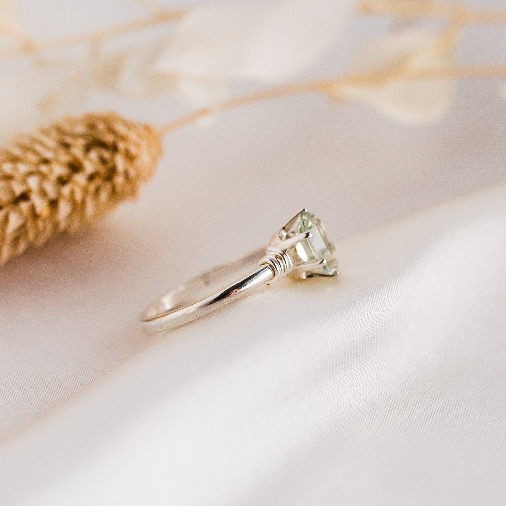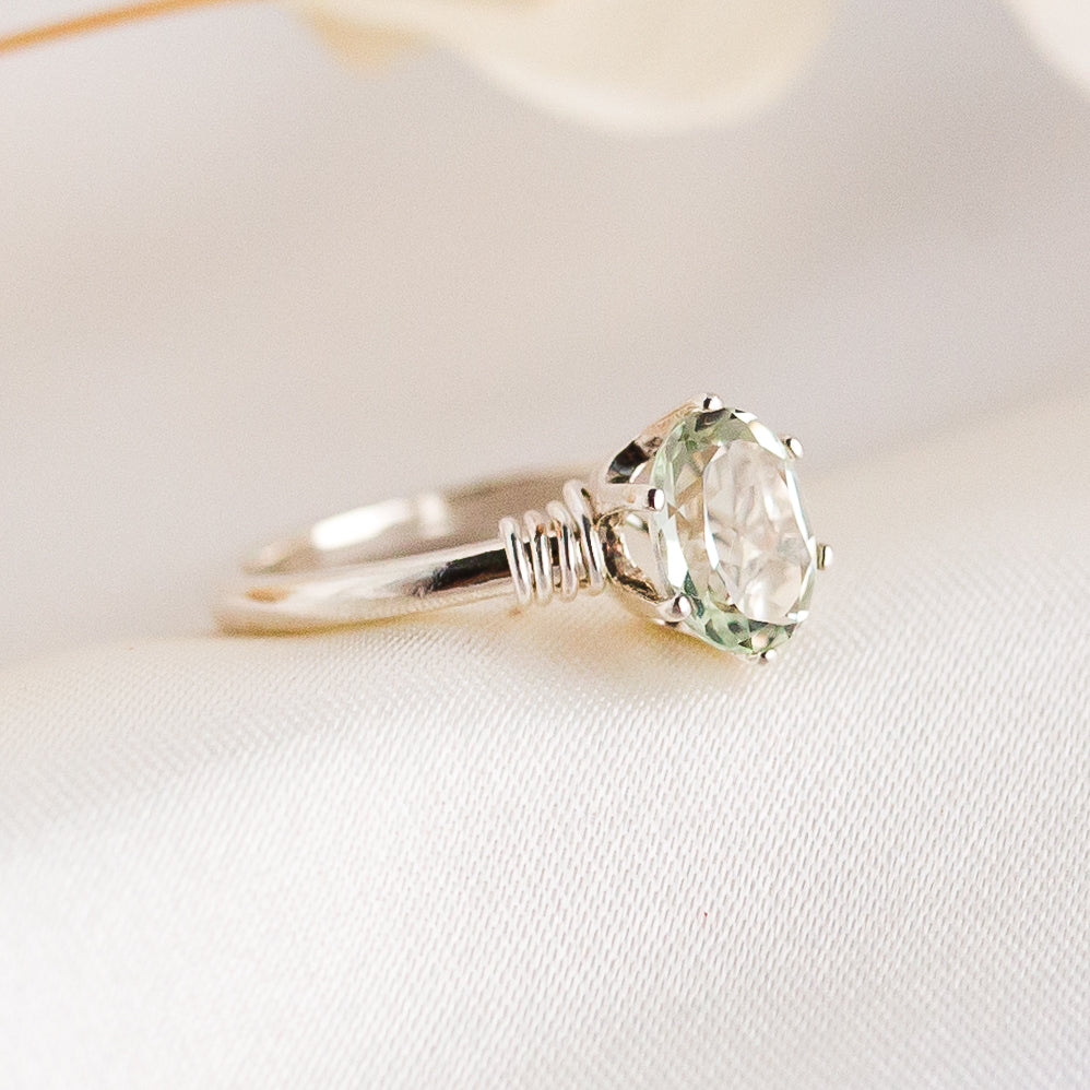 Hand set in one of our sterling silver rings, Green Amethyst is known for relieving stress and strain and dispelling fear and anxiety. This calming and meditative gemstone promotes peace and balance as well as alleviating sadness and grief.