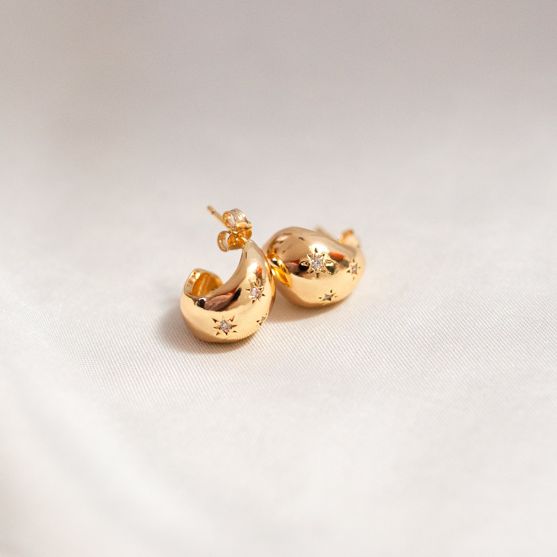 The star-studded Mitsy gold studs were one of our most popular sellers at this year's Spirit of Christmas at London Olympia. With a soft curved feature, these studs shape gently around the lobe with unique, subtle hammered aspects. The versatile size means these can be worn in any lobe piercing and makes them perfect for stacking.