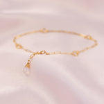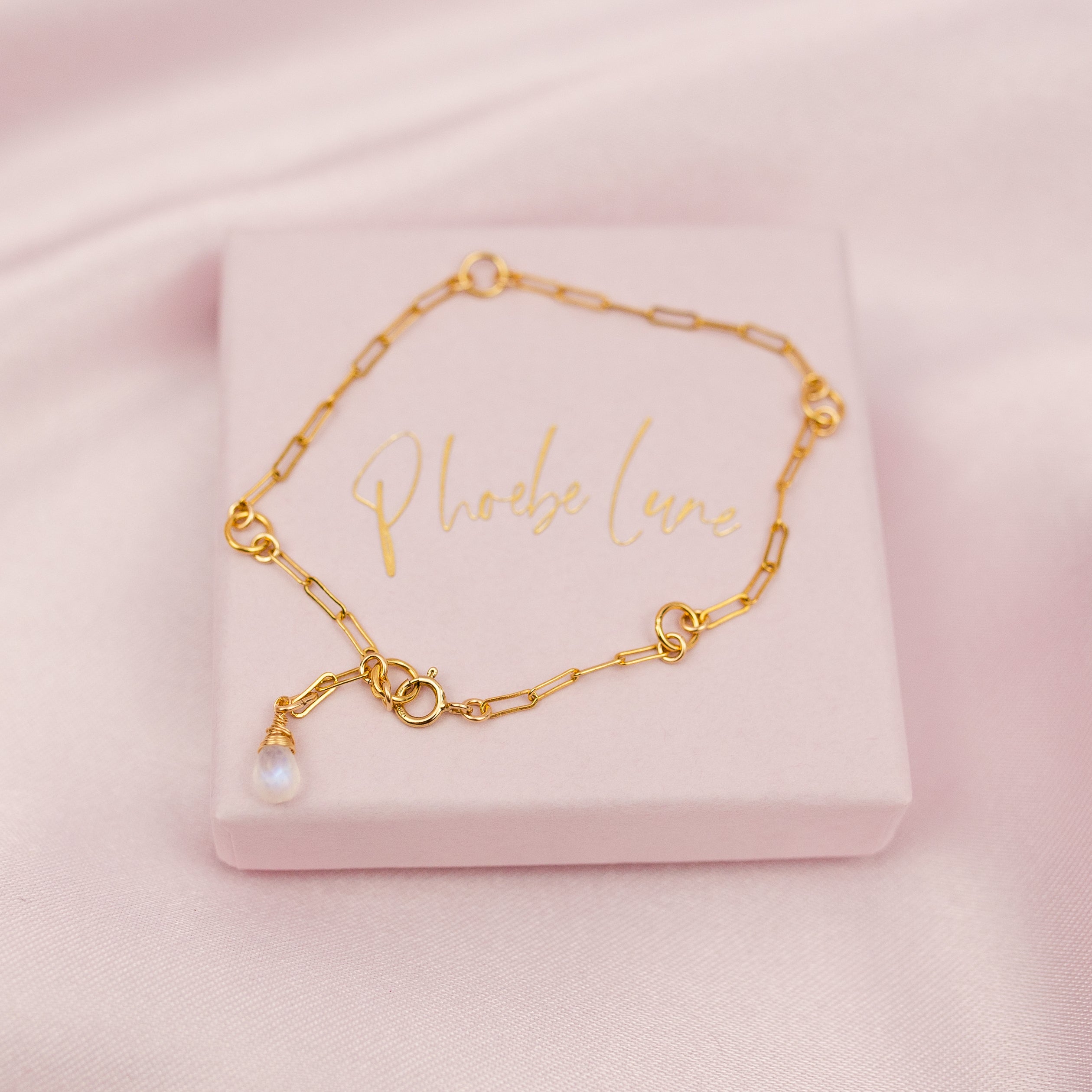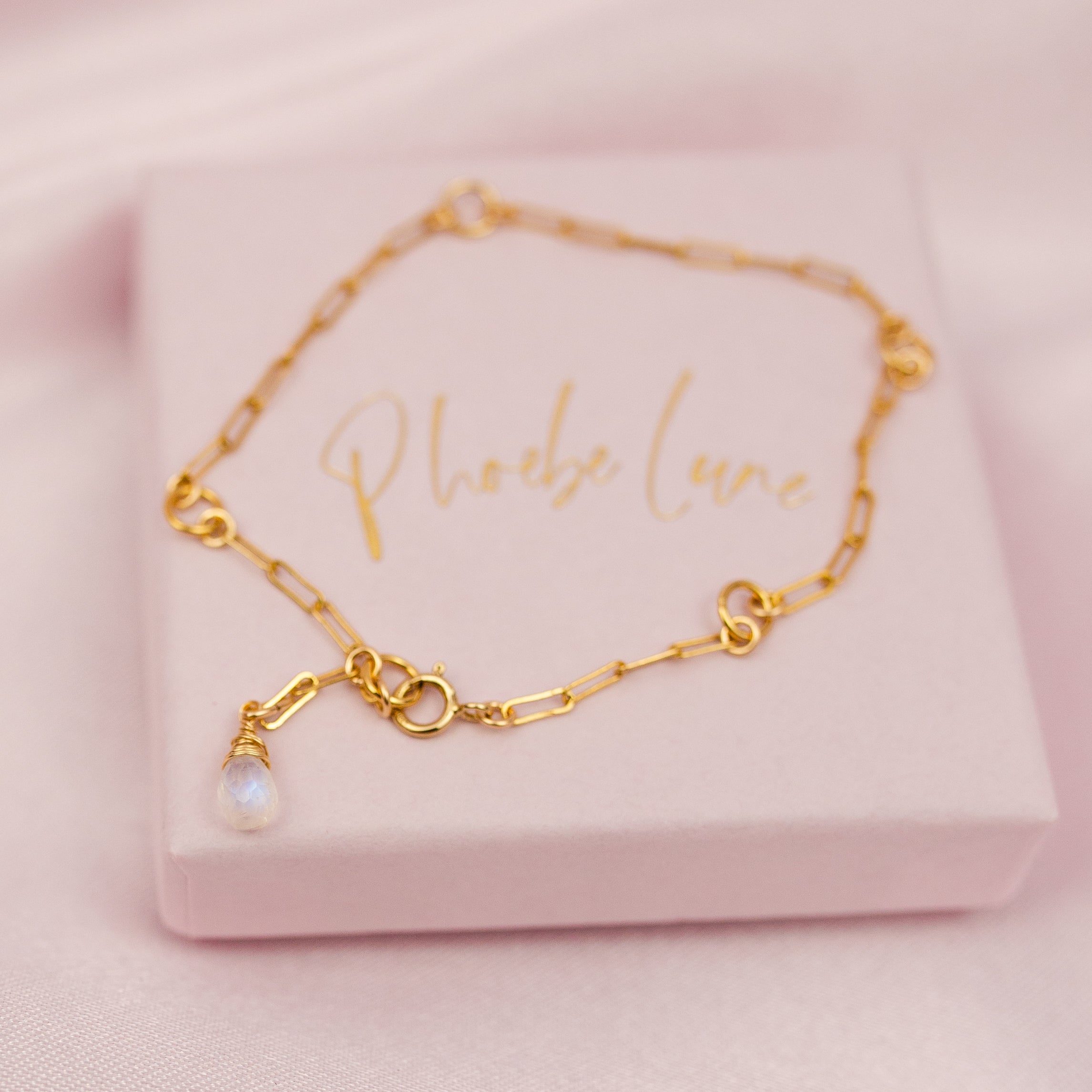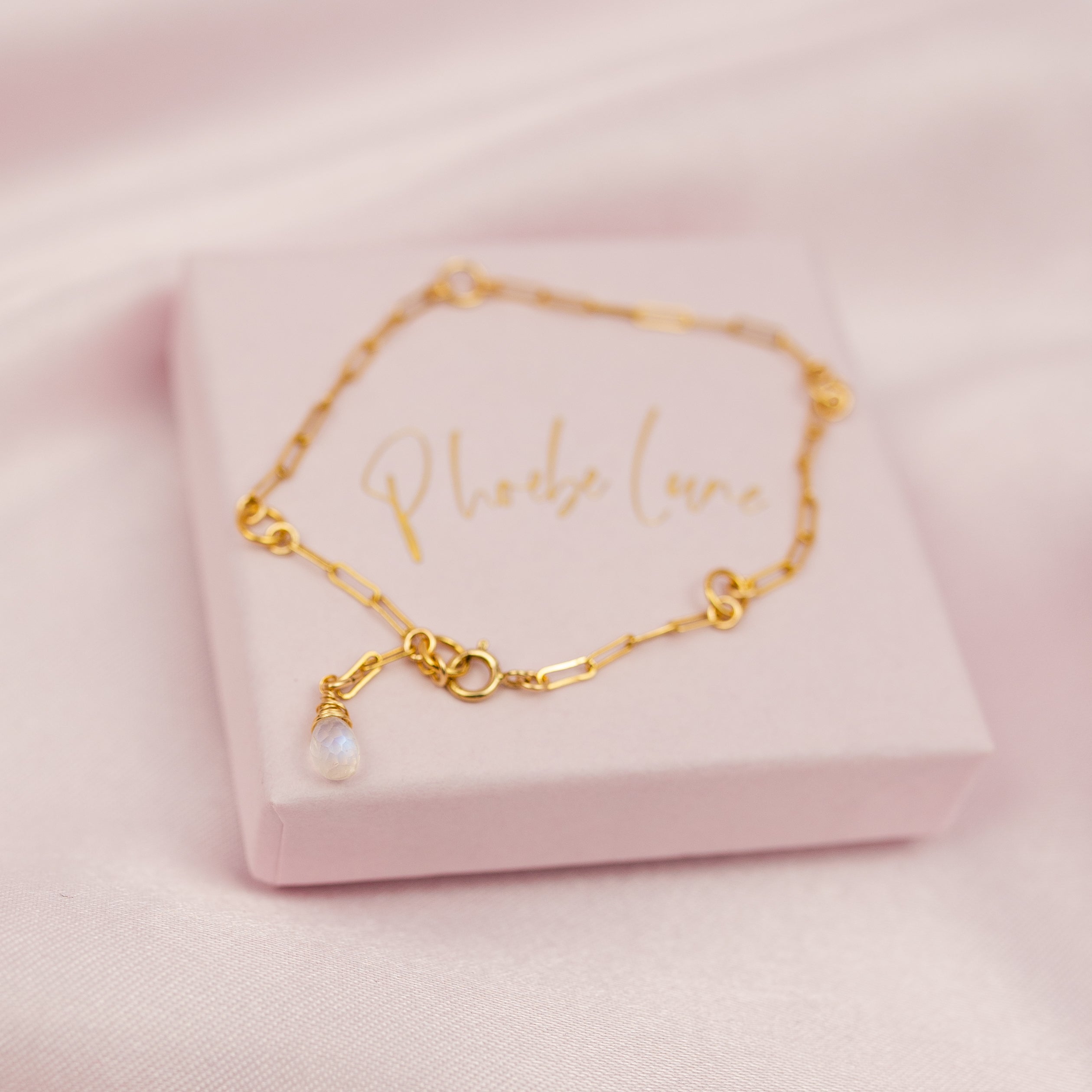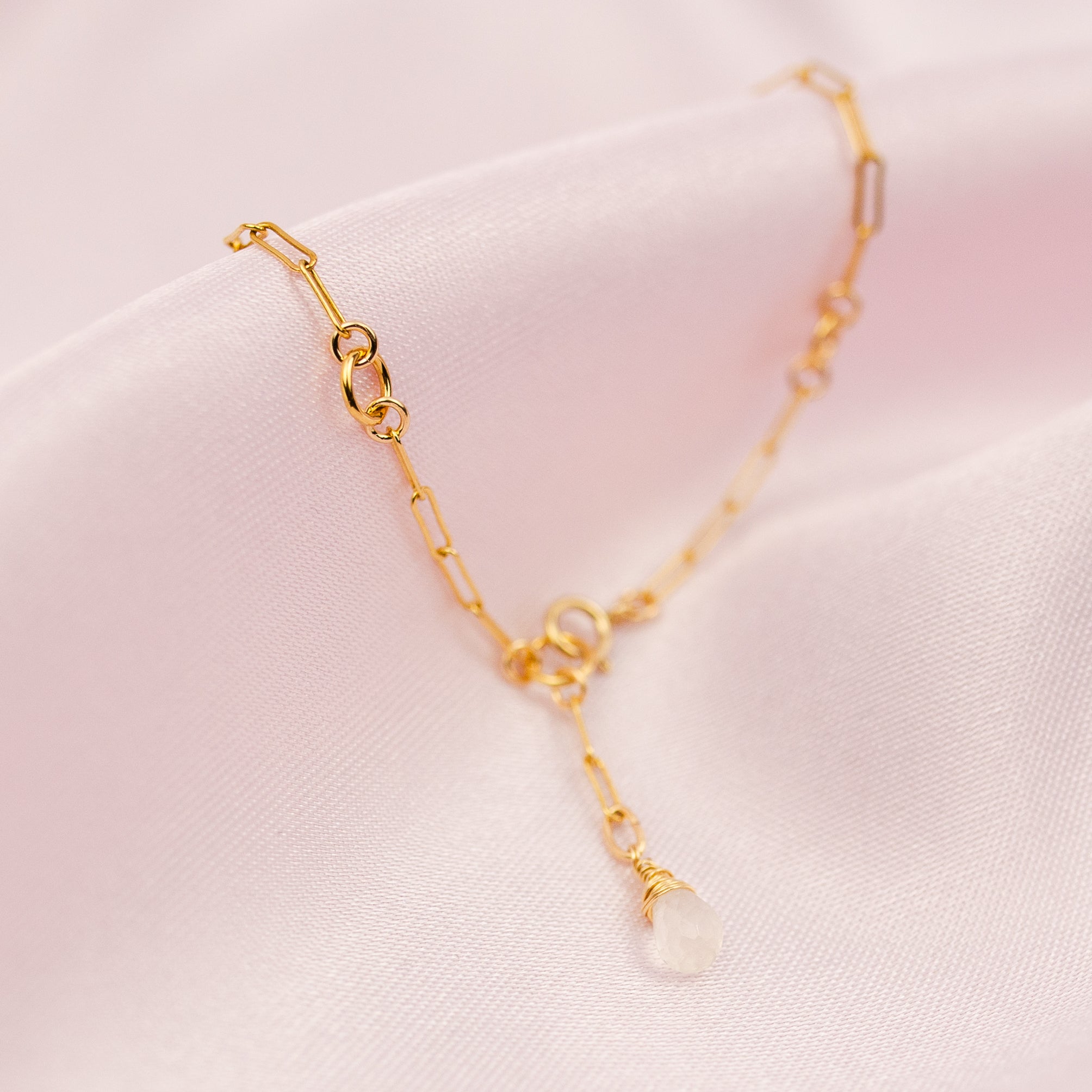 With the loop studded gold filled chain, the hand wrapped Moonstone droplet feature at the end of the chain is designed to cascade down, creating a unique, tumbling effect.