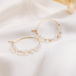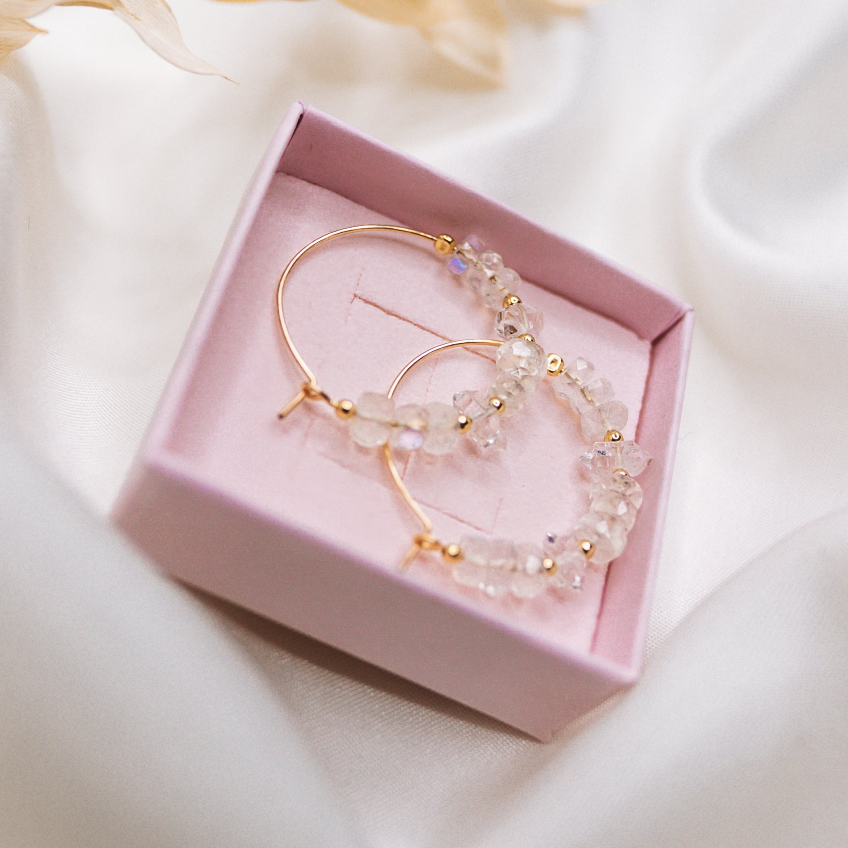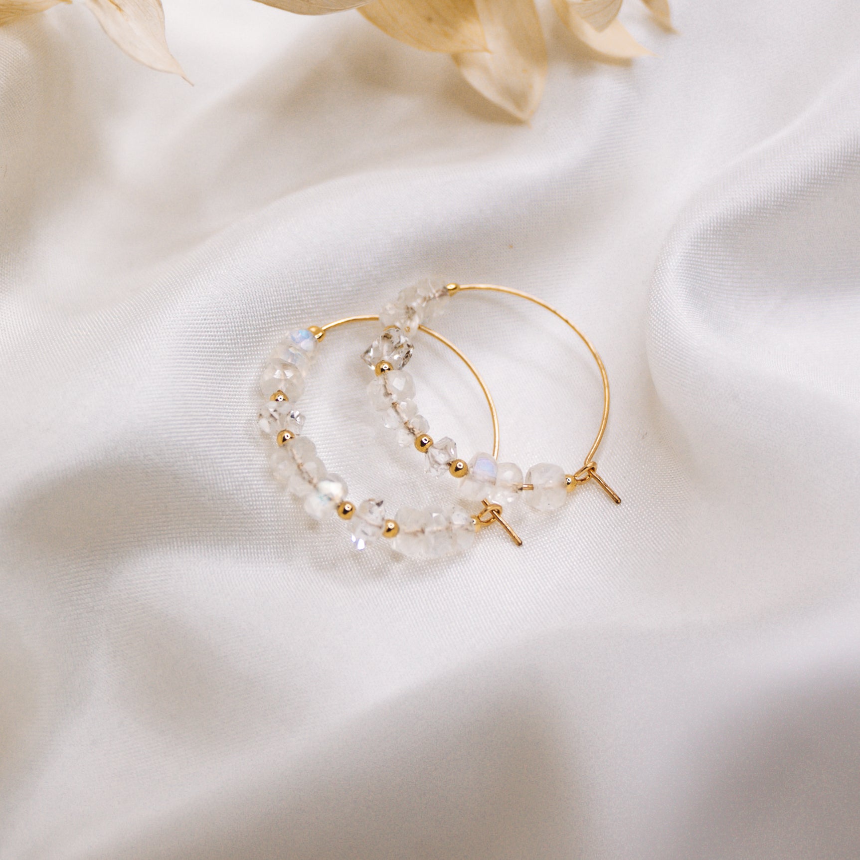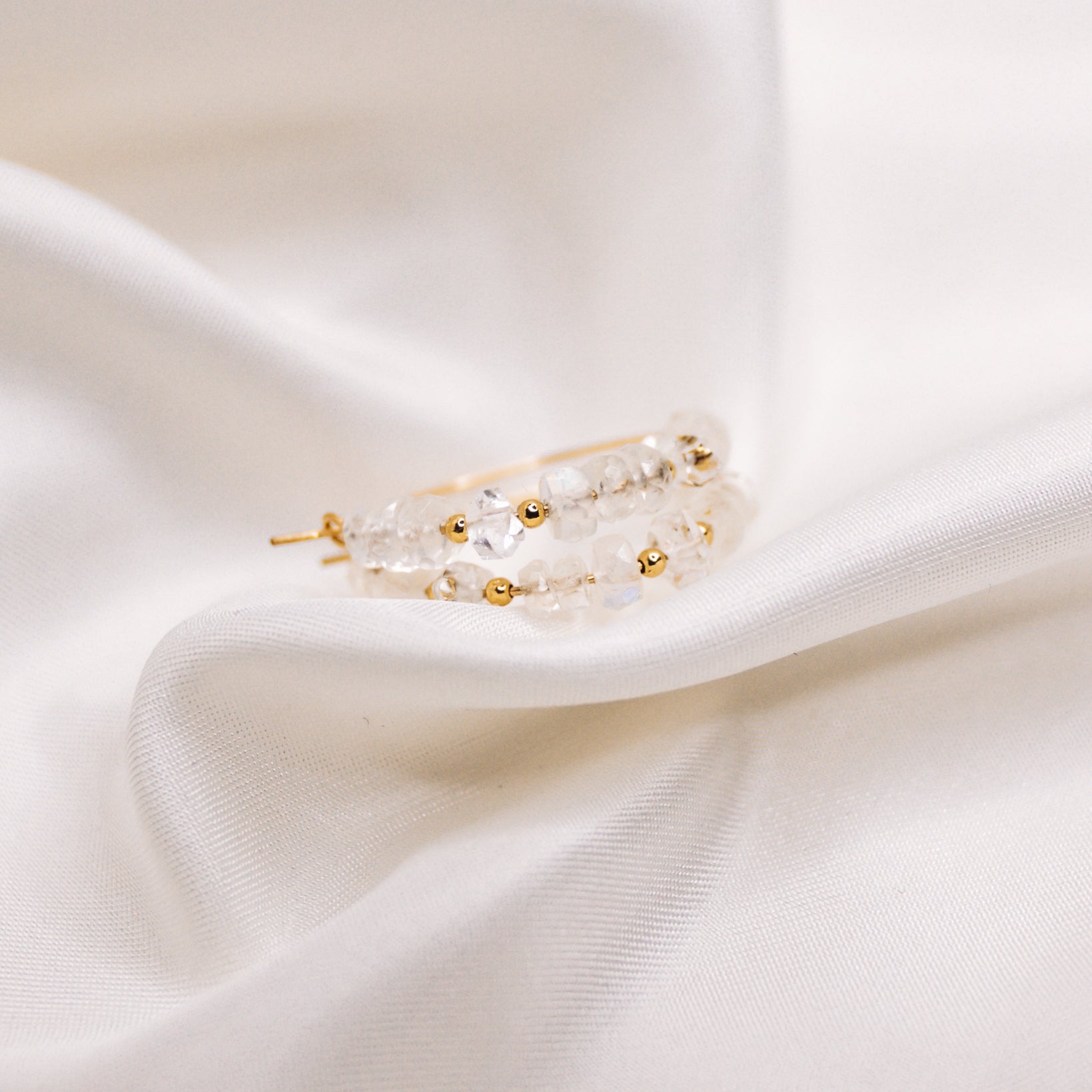 The classic Wishing Hoops in gold fill with ethically sourced, hand cut Moonstone and Herkimer Diamond.