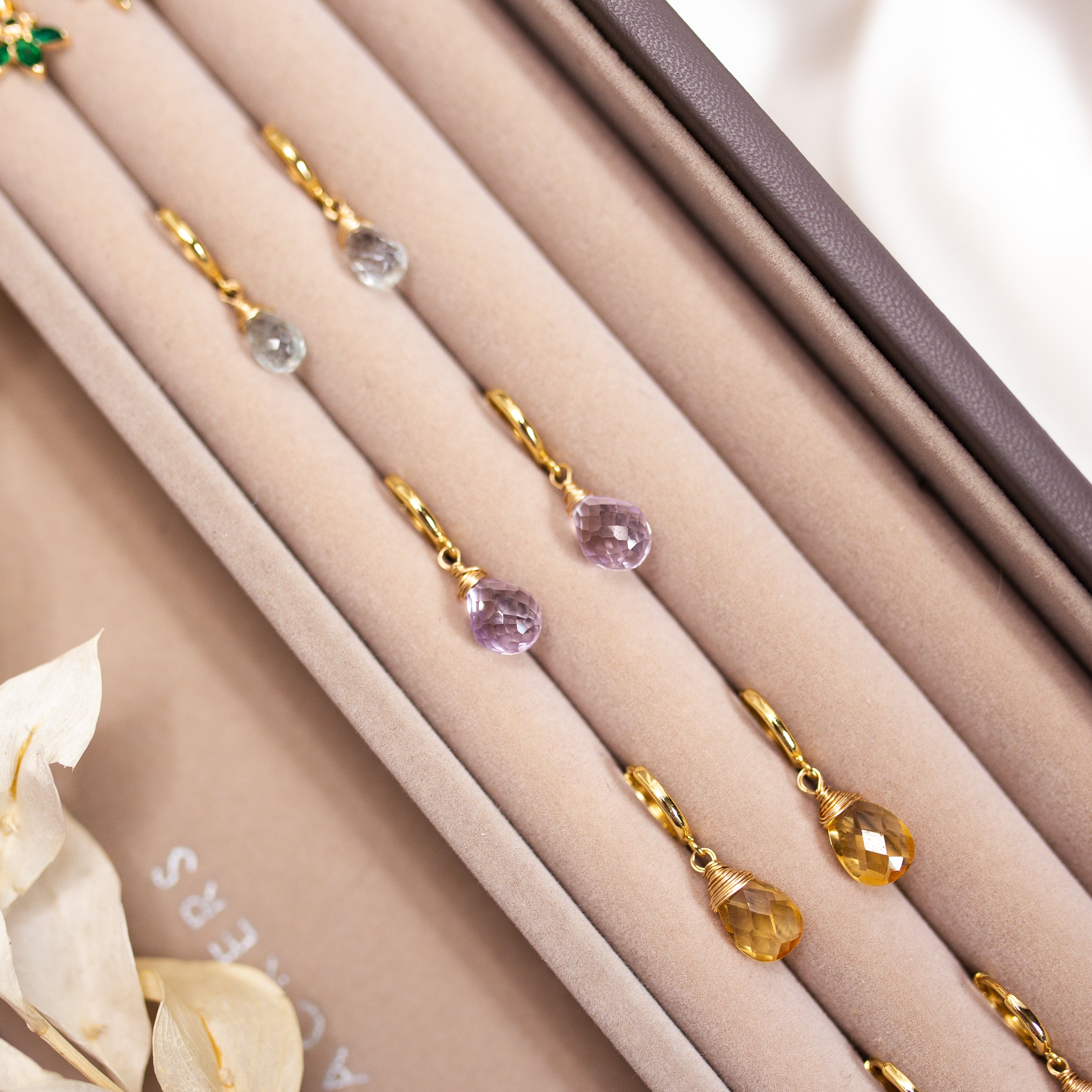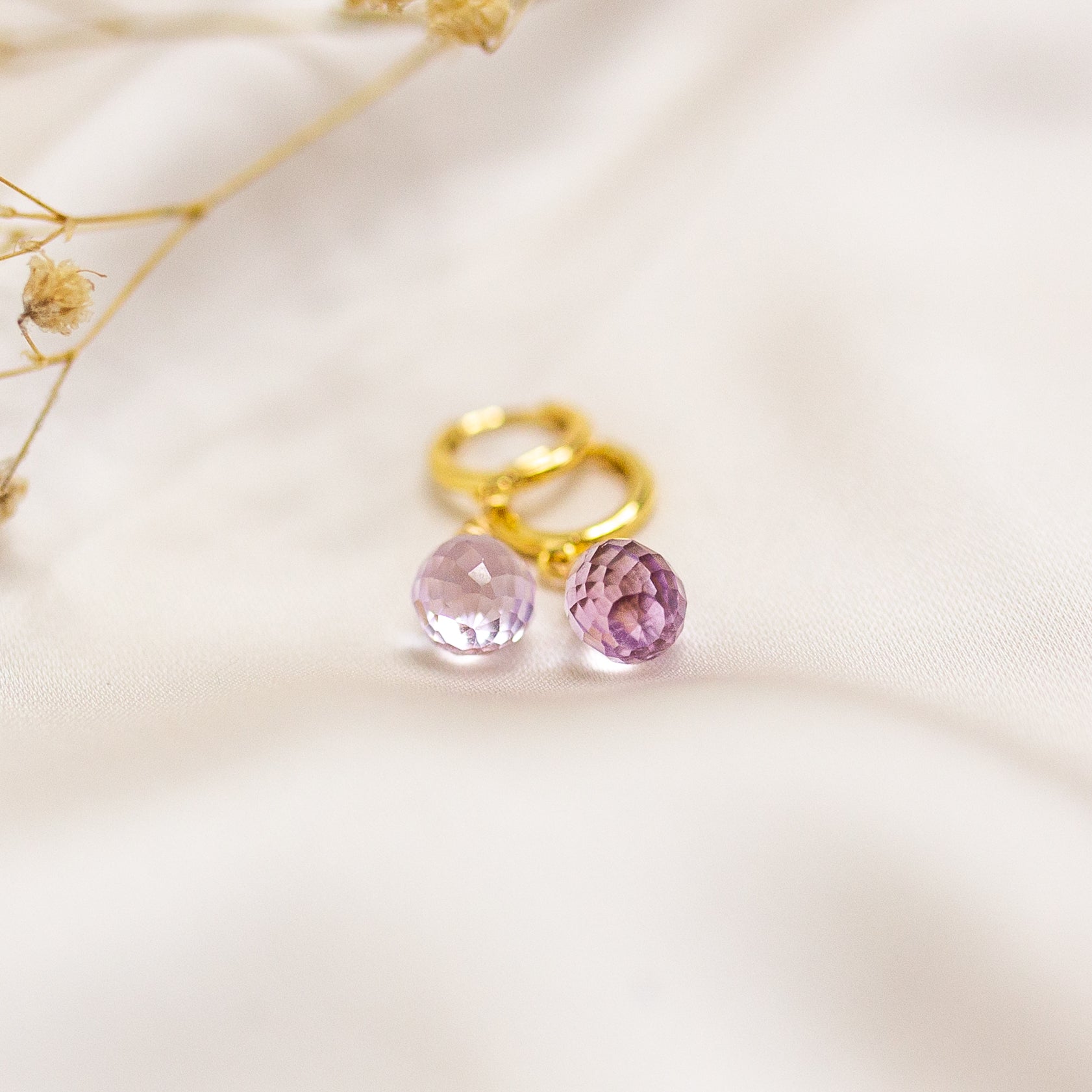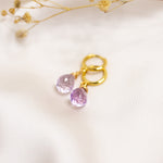 This delicate piece of jewellery is perfect for adding a touch of sophistication and charm to any outfit. The huggie design ensures a secure and comfortable fit, while the 14k gold plating adds a luxurious touch and makes them suitable for sensitive ears. The Amethyst is hand wrapped in gold filled wire, providing a simple yet elegant accent, making it the perfect accessory for both casual and formal occasions. Add this timeless piece to your collection and elevate your style to the next level.