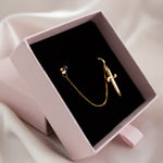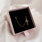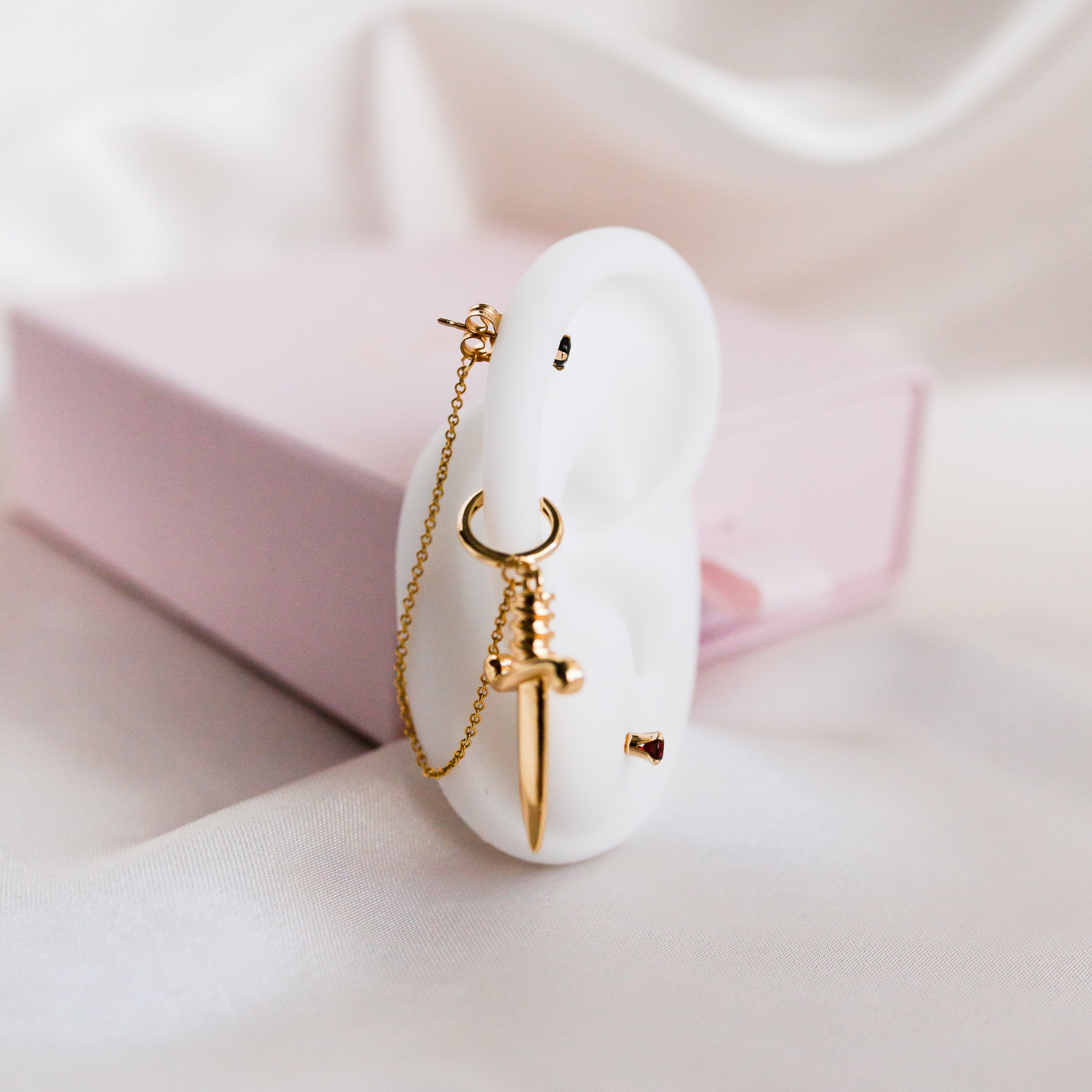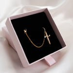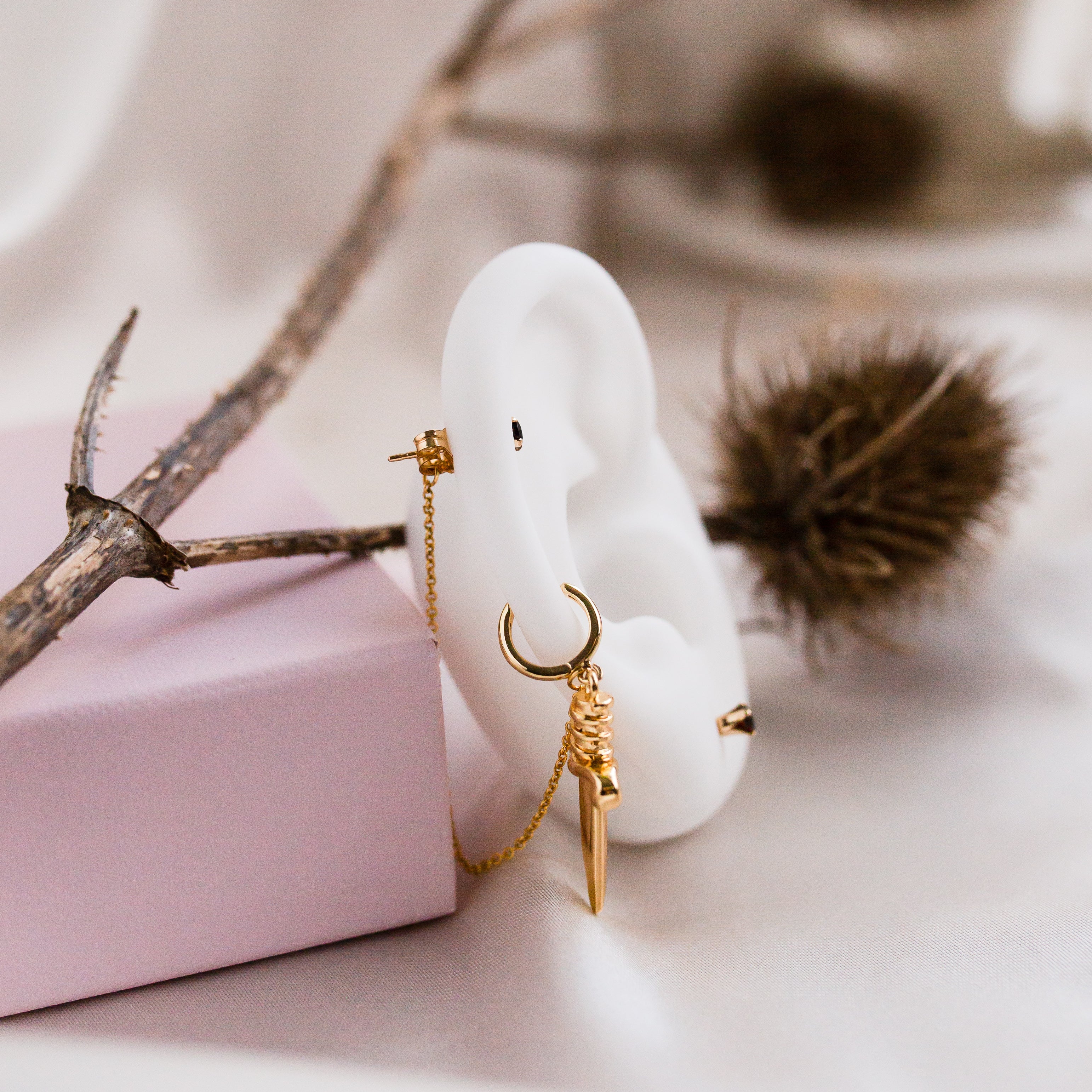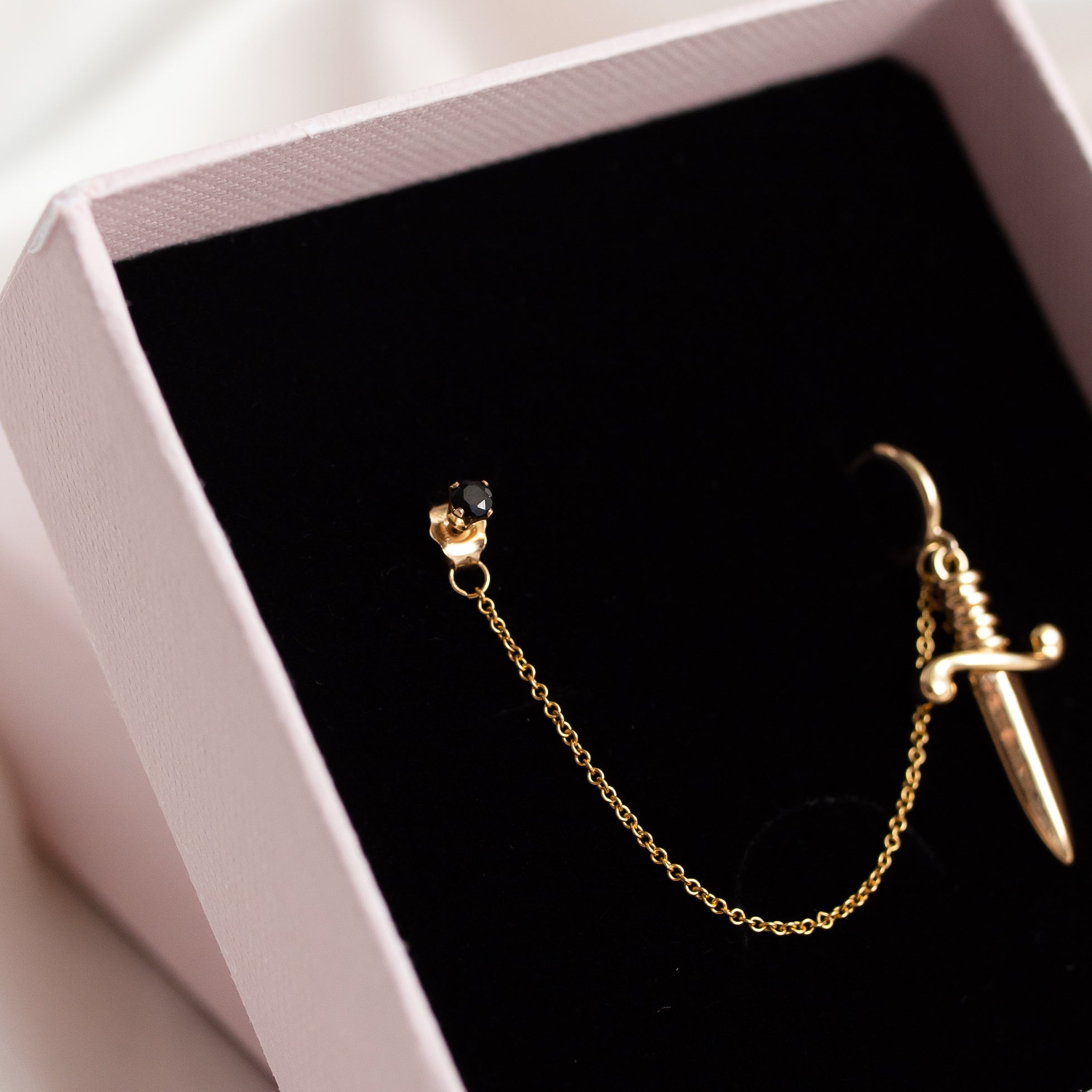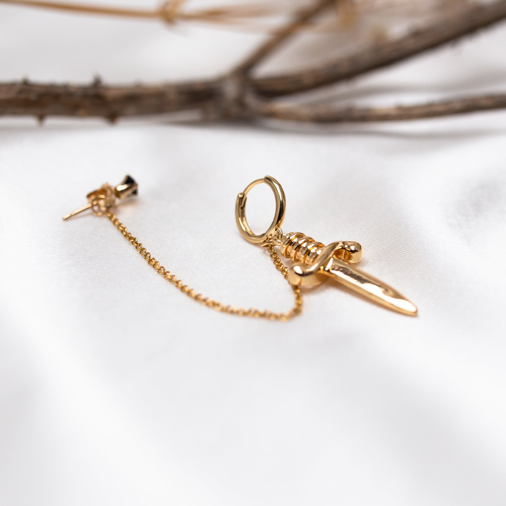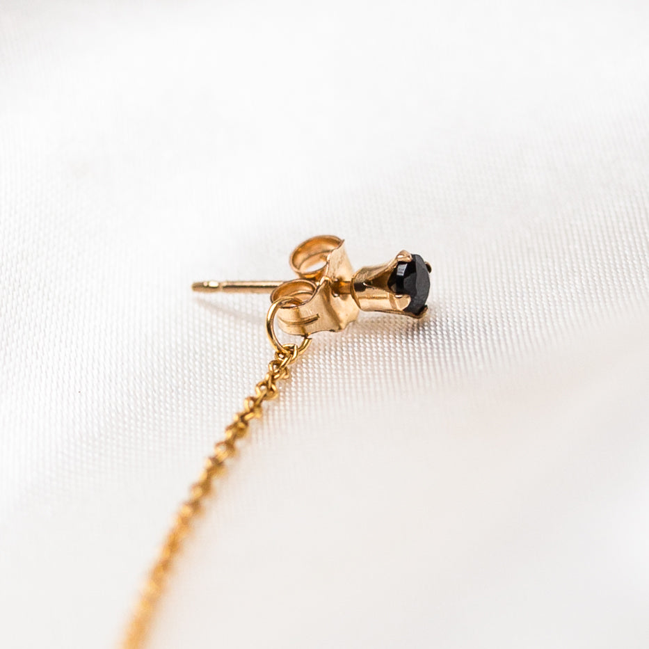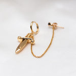 Hidden behind a golden dagger, the gold filled cable chain drapes delicately between a 14kt gold plated mini huggie hoop and a Black Spinel gold filled stud.