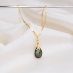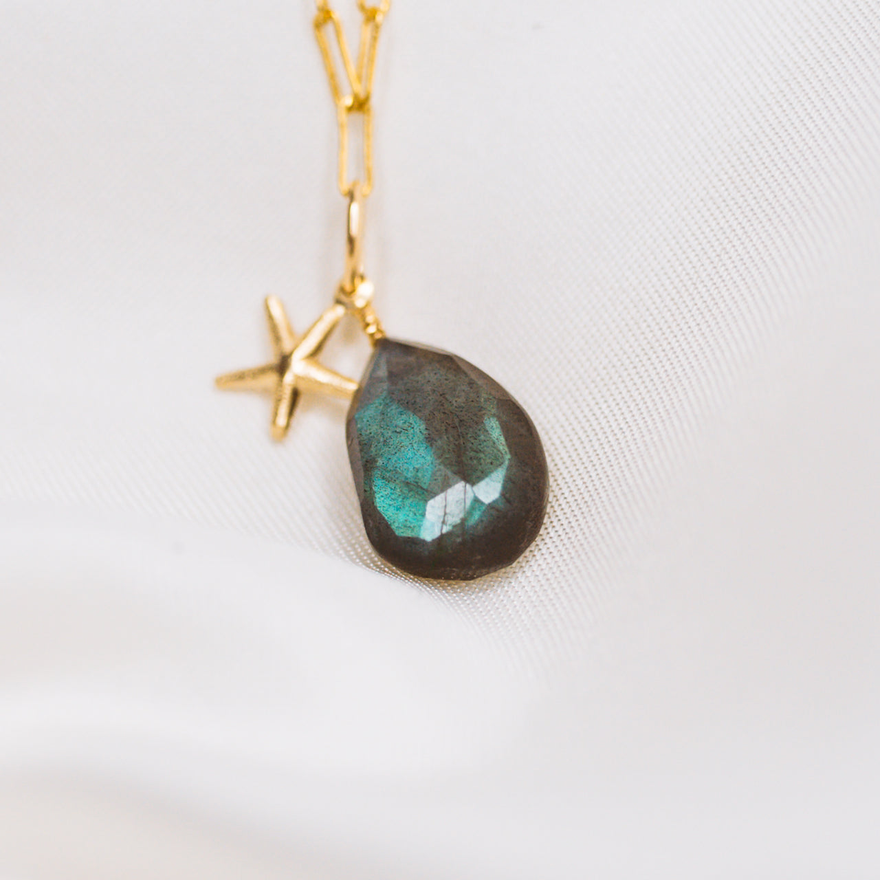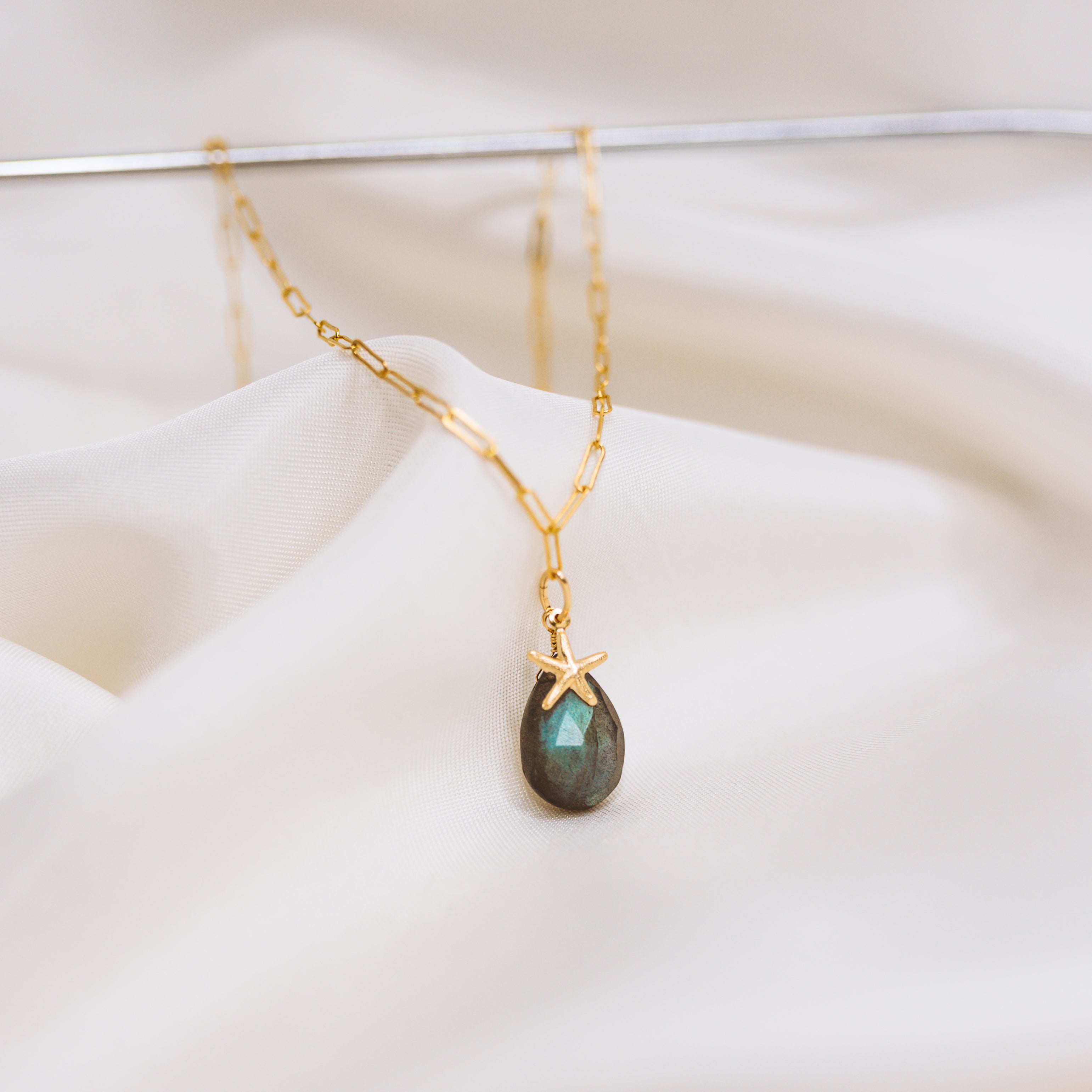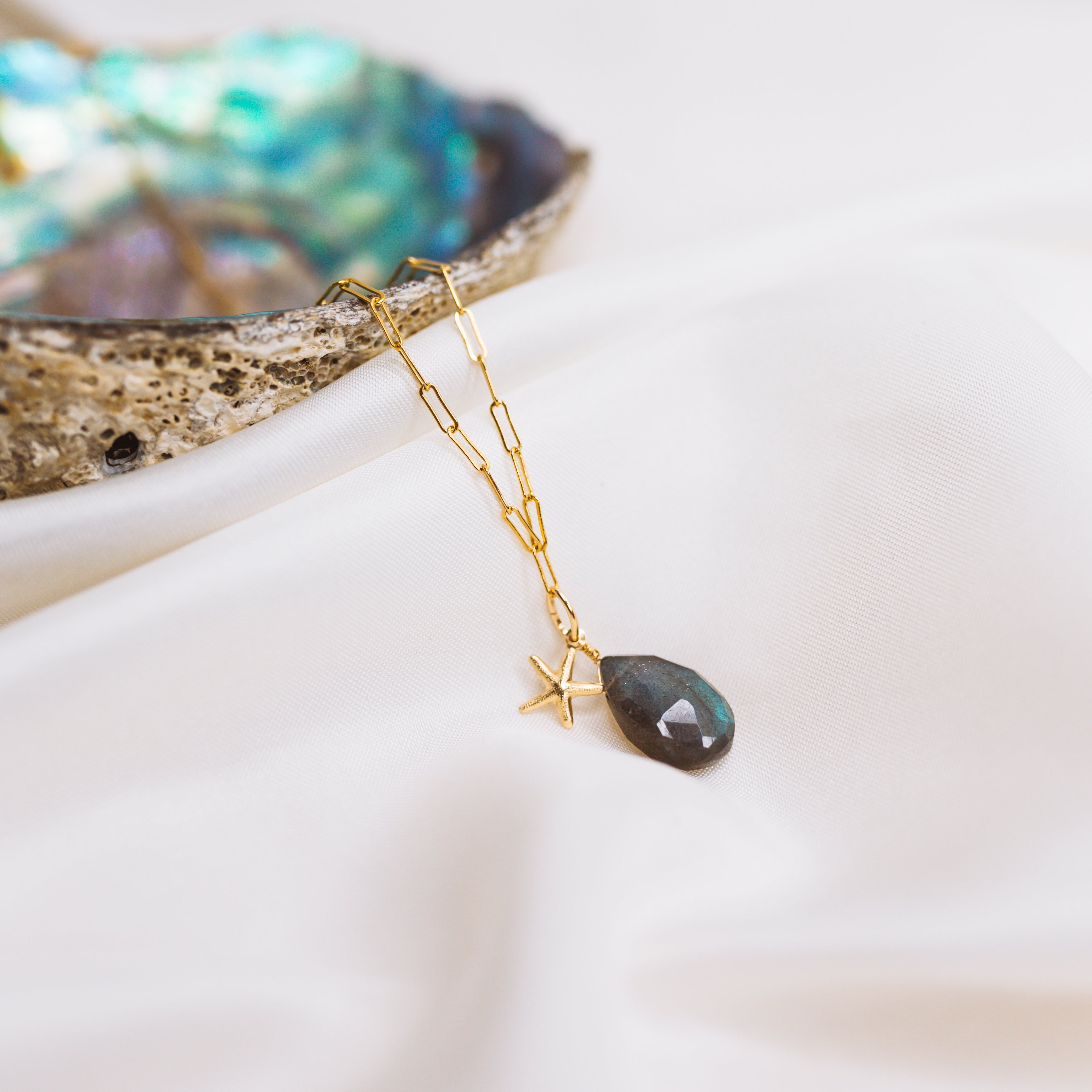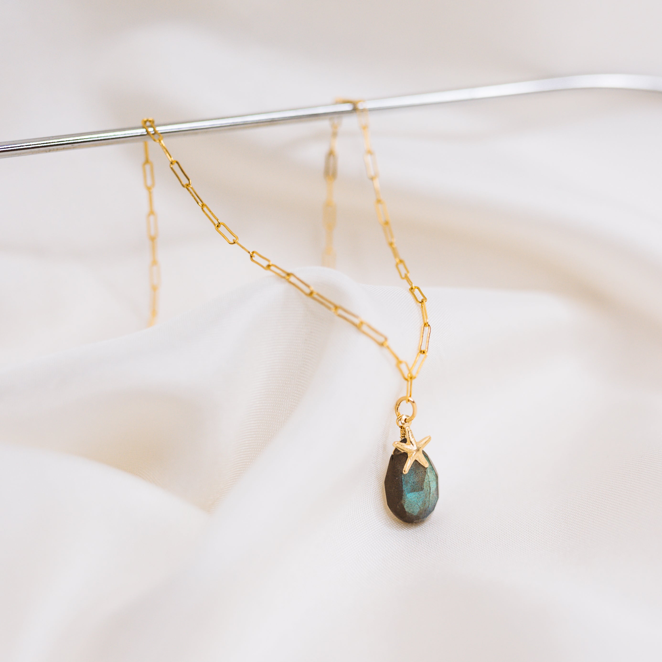 Gold filled 16" necklace adorned with Labradorite and a gold filled starfish charm.