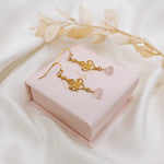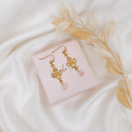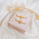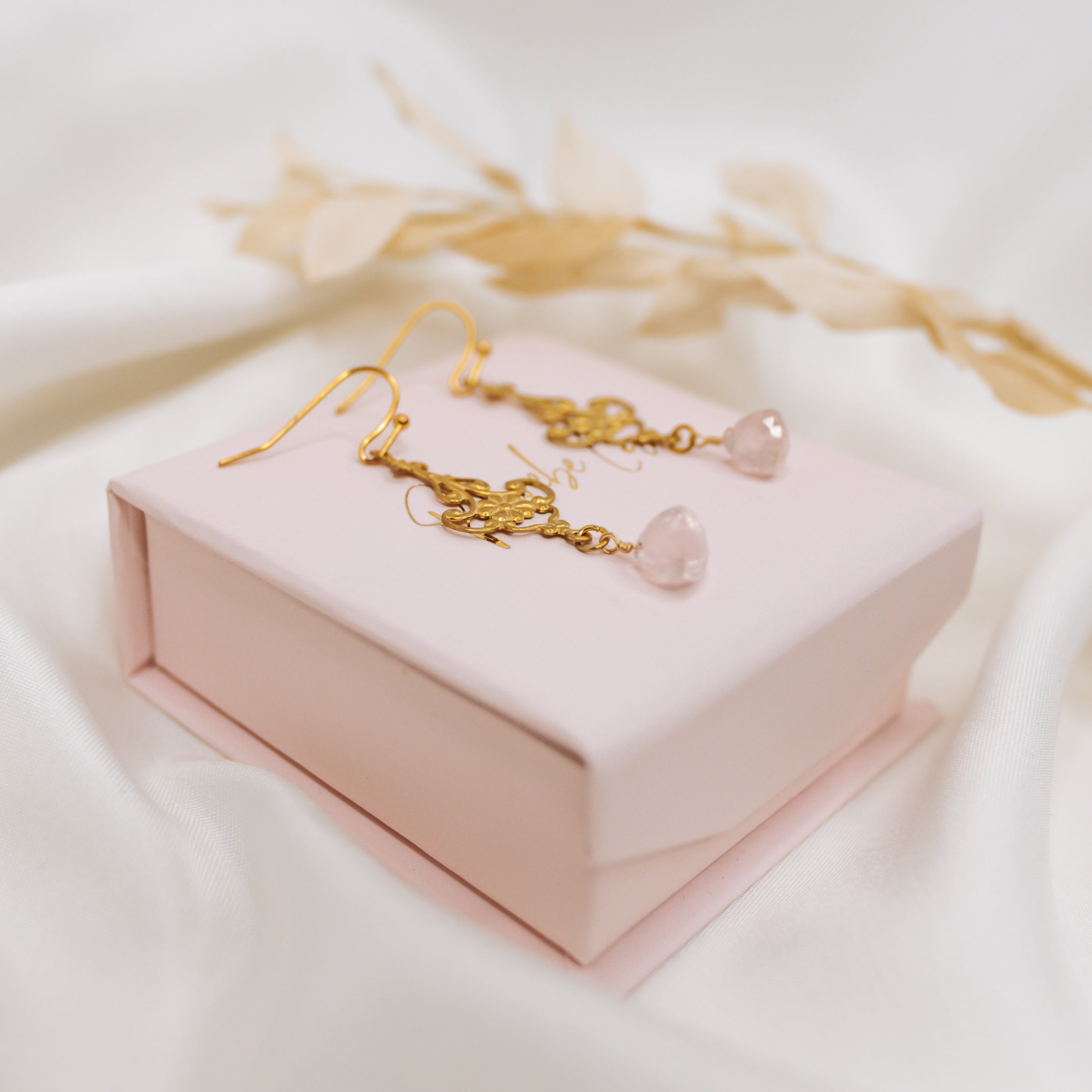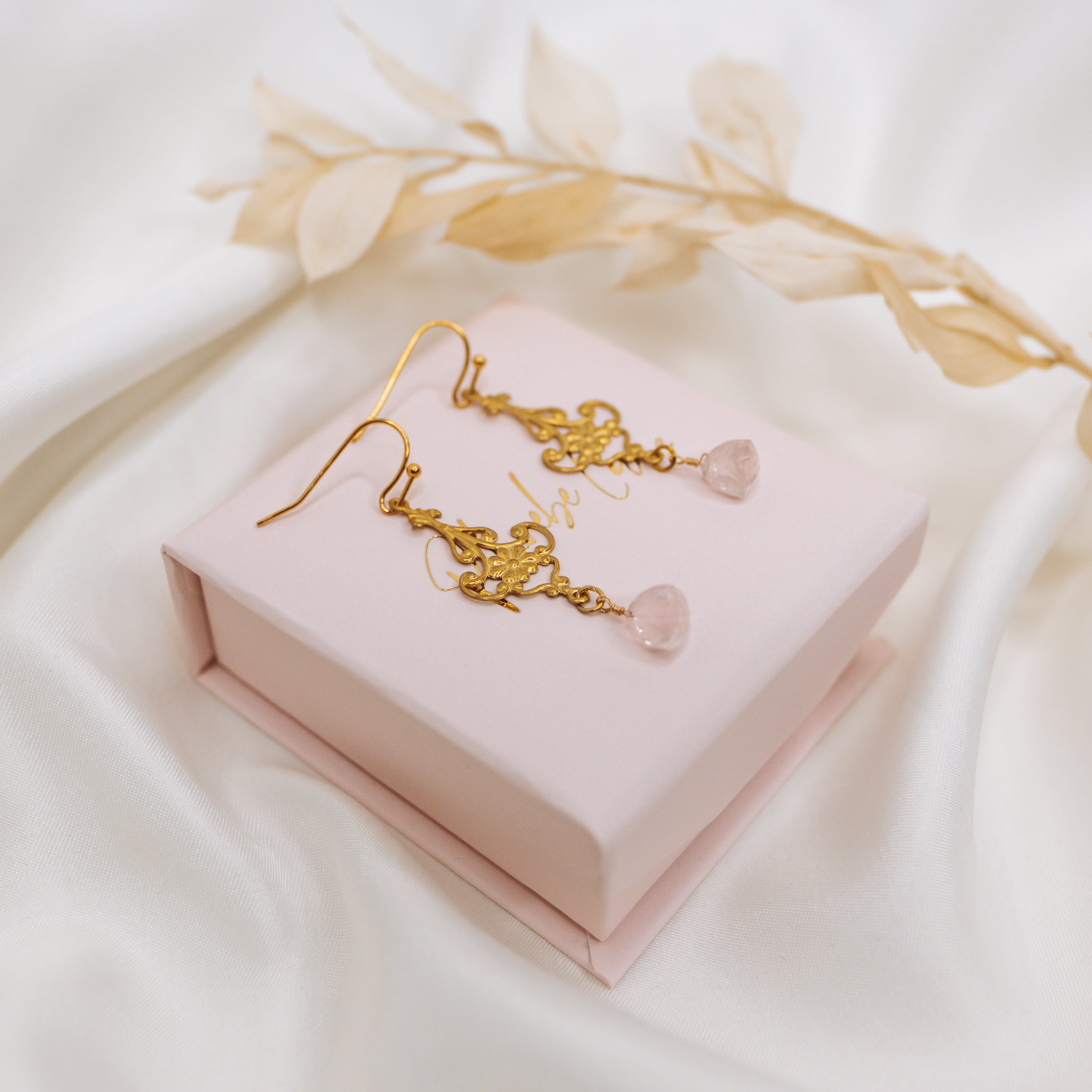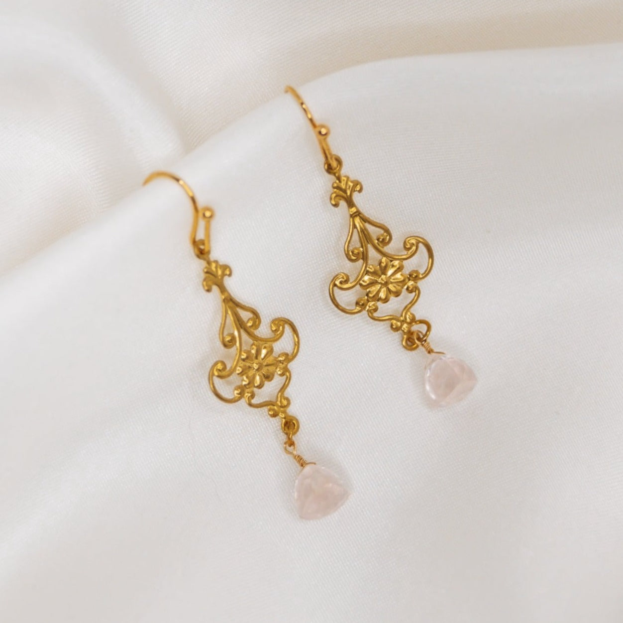 Adorned with golden filigree, the Rose Quartz Endellion hooks bring a lightweight, regal addition to your collection.