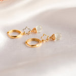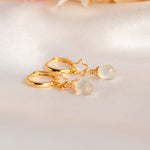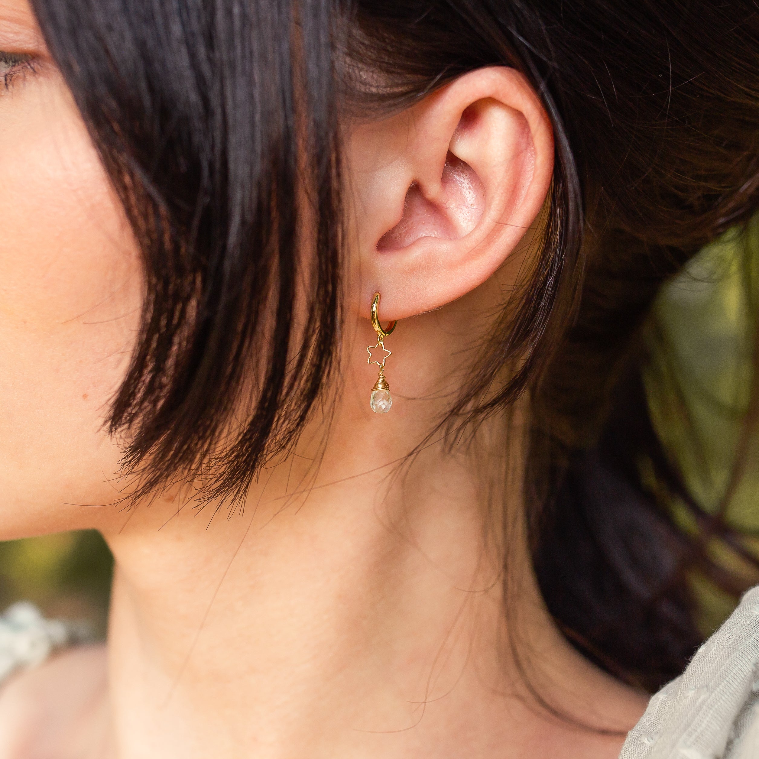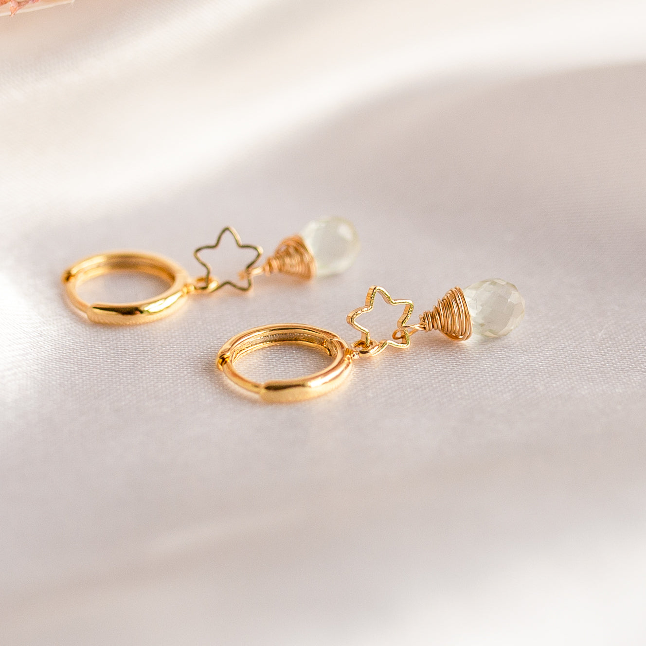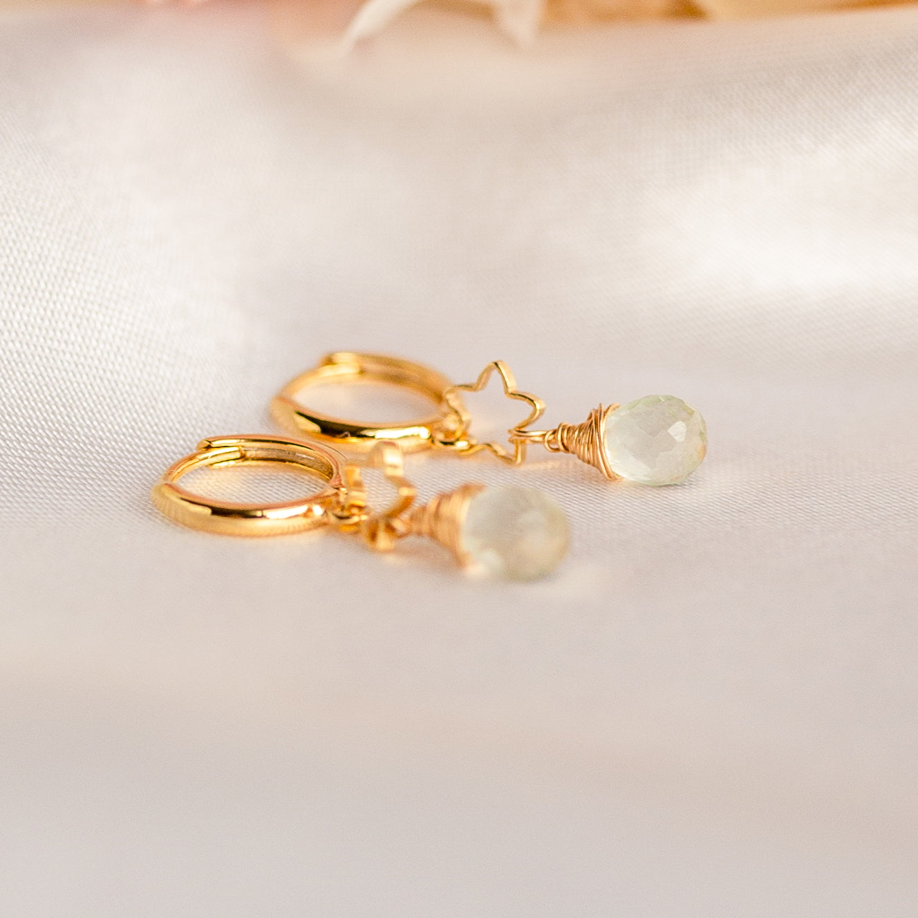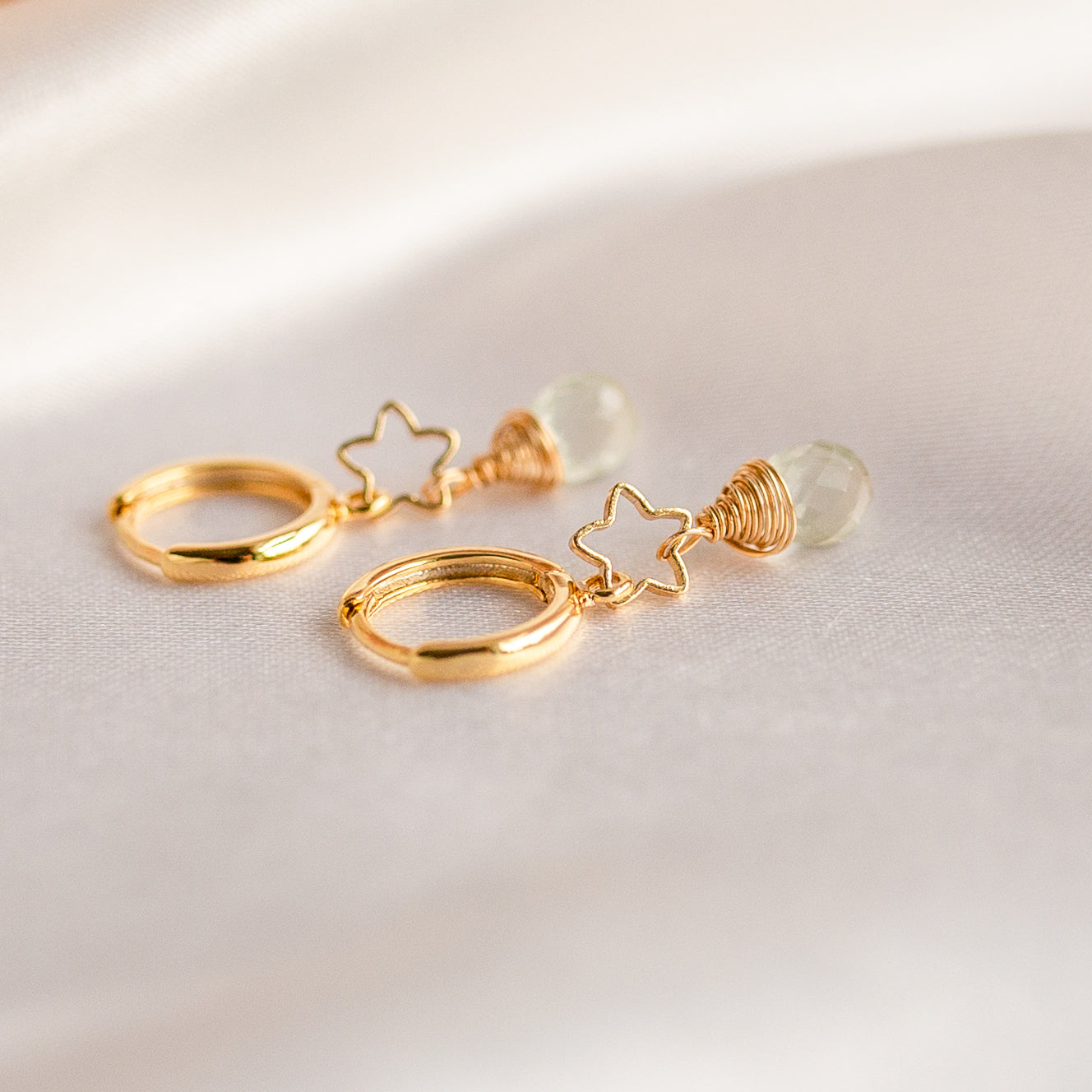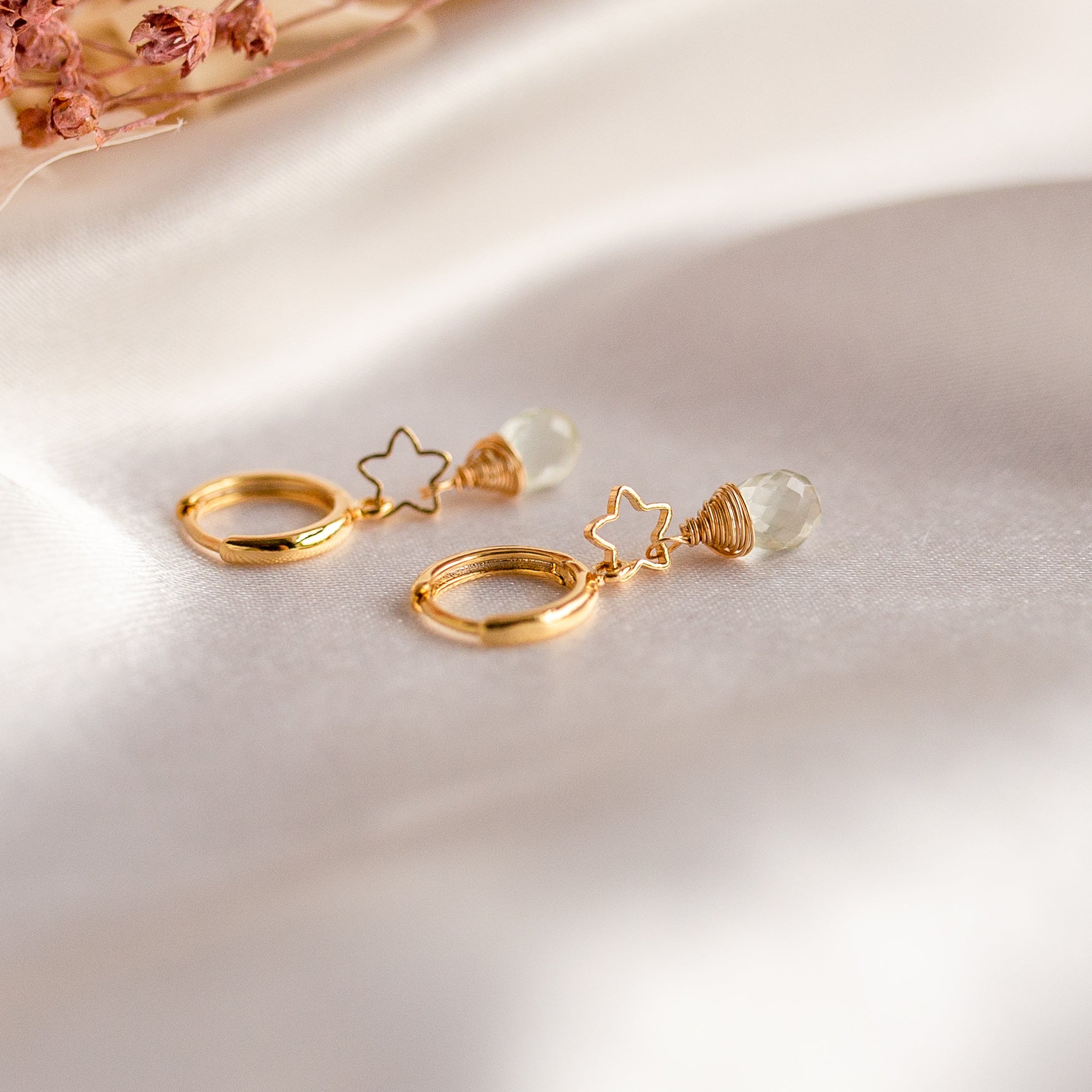 The soft sage greens of Amethyst fall gently from a golden star silhouette. Paired with our mini golden huggies, the Sage earrings are perfect for layering or as a simple, magical pair for those who like a more minimal look. The Green Amethyst droplets beneath are wrapped in gold filled wire and are a grounding stone known for strengthening peace, calm and positive energy.