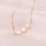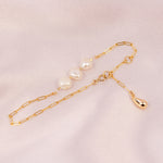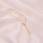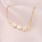 With the powerful triple Pearl accent and gold filled link chain, the Empress bracelet can be adjusted to any length. The golden water droplet feature at the end of the chain is designed to hang down, creating a unique, tumbling effect.