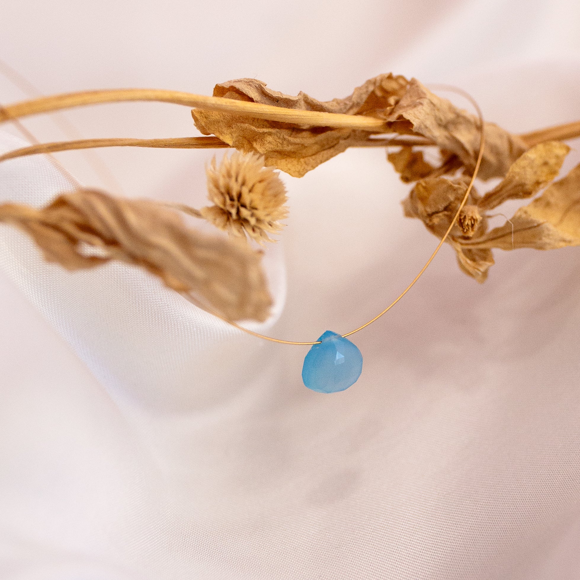 The gold plated strong and dainty stainless steel wire holds a lightly structured shape to keep your crystal sat safely atop the base of your neck, all finished with gold filled clasps and connectors.