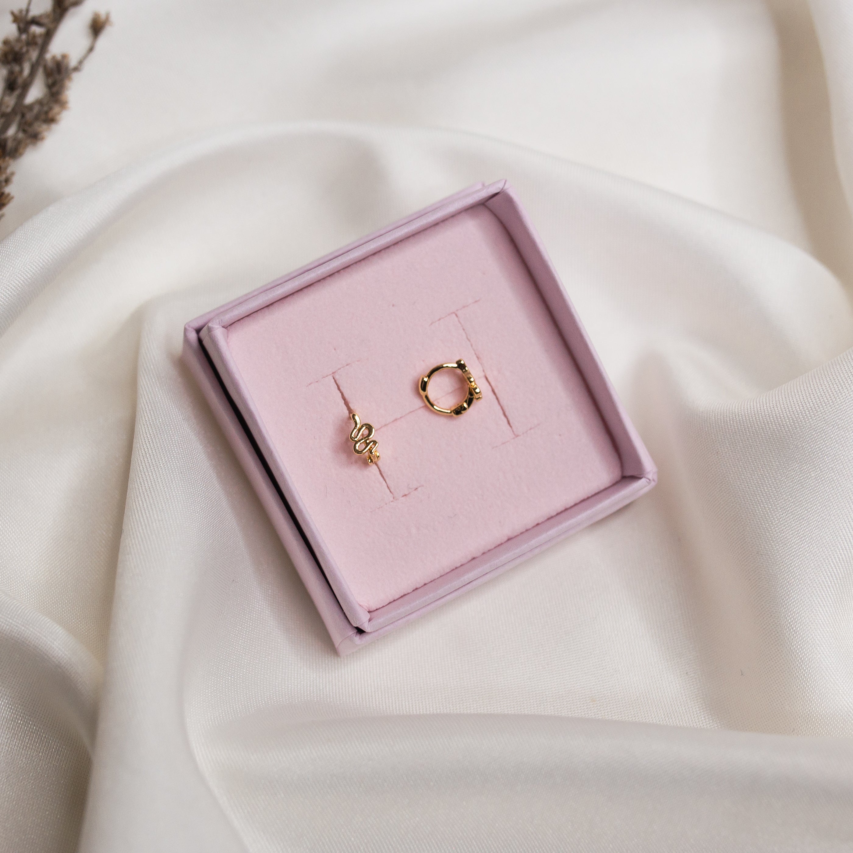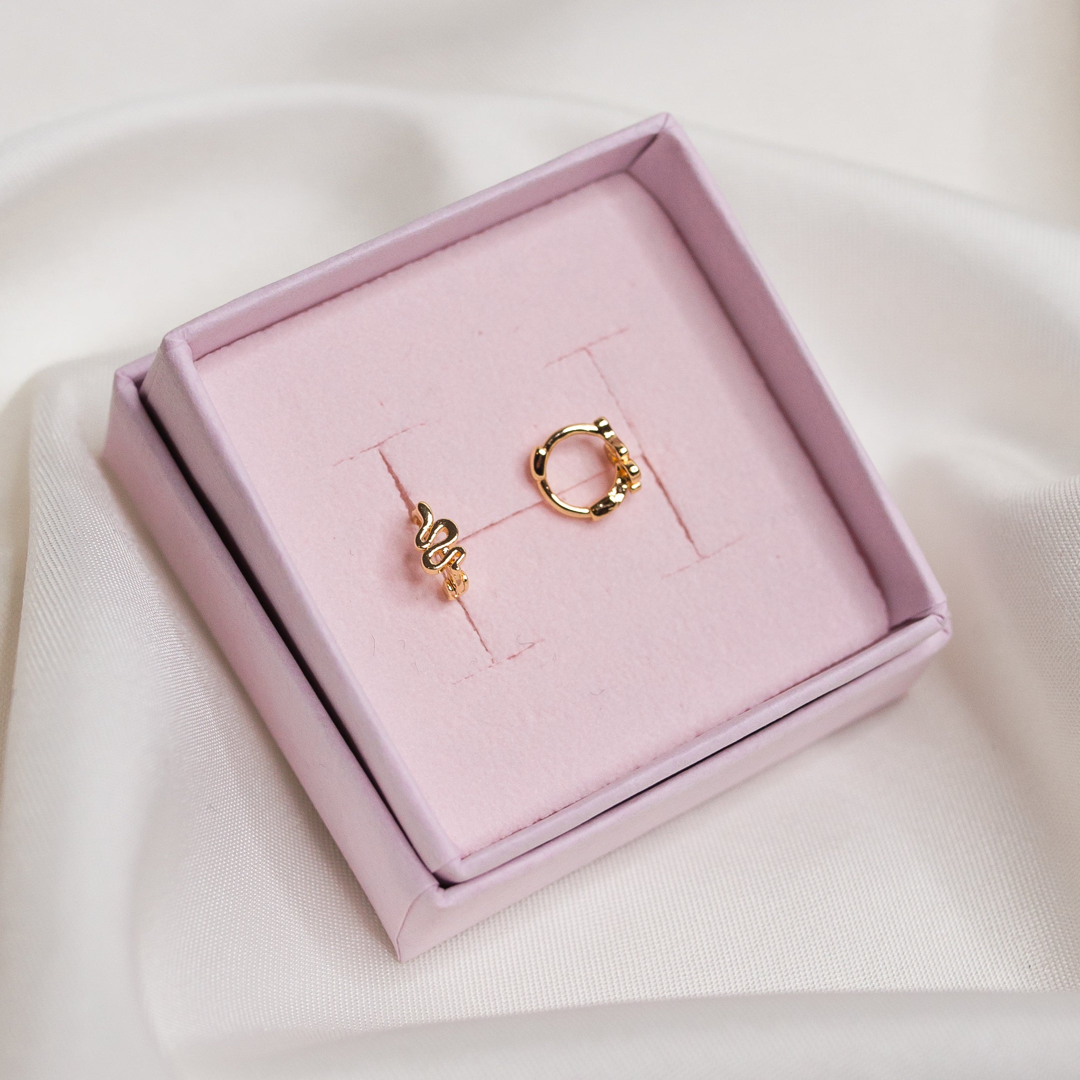 The smallest of our mini huggies series, the Serpentine mini huggies have an easy click huggie feature. This makes them perfect for wearing in any piercing lobe, cartilage or even nose! These huggies are one of our smaller designs, meaning they're perfect for small piercings, simple looks and stacking.